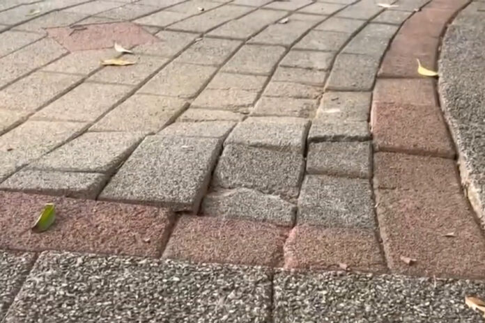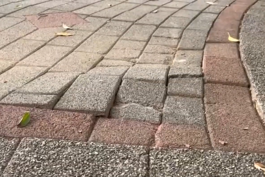 新寶公園內的地坪不平、鋪面凹凹凸凸,有民眾在這運動跌倒受傷,針對公園地坪不平,平鎮區公所已先放置三角錐提醒民眾小心。
