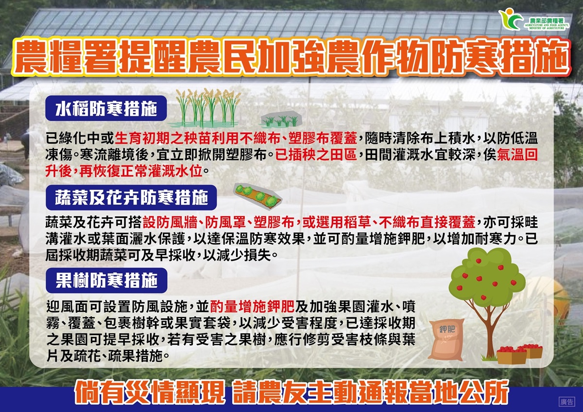 雜糧作物建議採取畦面覆蓋塑膠布、稻草或畦溝灌水等防寒措施;此外,雖多數茶區茶樹目前為休眠期,但仍需特別注意低溫對茶樹的影響,並進行灑水防護、地表或樹冠覆蓋、防霜風扇法等預防措施,以減低寒害影響茶樹生長。