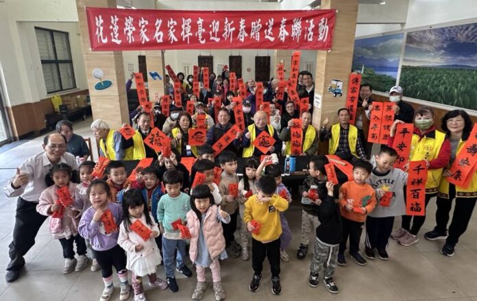 春聯揮毫老師們與榮家長輩們及幼兒園小朋友合影,場面溫馨。(圖∕花蓮榮家提供)