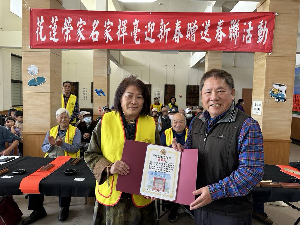 ▲花蓮榮家家主任游文勇(右)贈狀感謝花蓮縣長青書畫會理事長湯大凰(左)。(圖/花蓮榮家提供,下同)