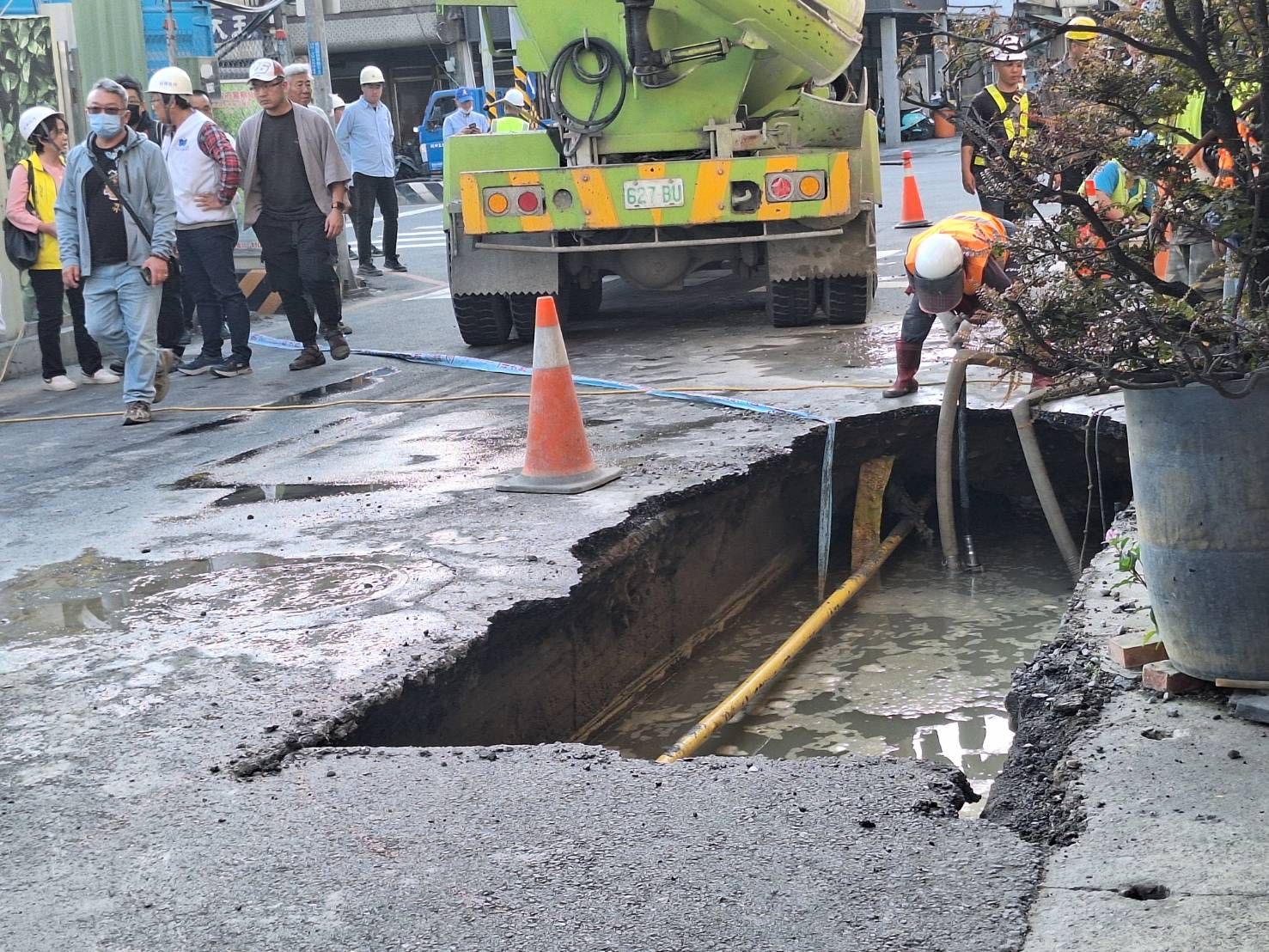 消防與警消獲報後趕往現場警戒,工務局則緊急協調自來水公司、電信與其他管線單位進行檢修,並調派廠商灌漿回填,避免坑洞進一步擴大、危及一旁民宅結構。