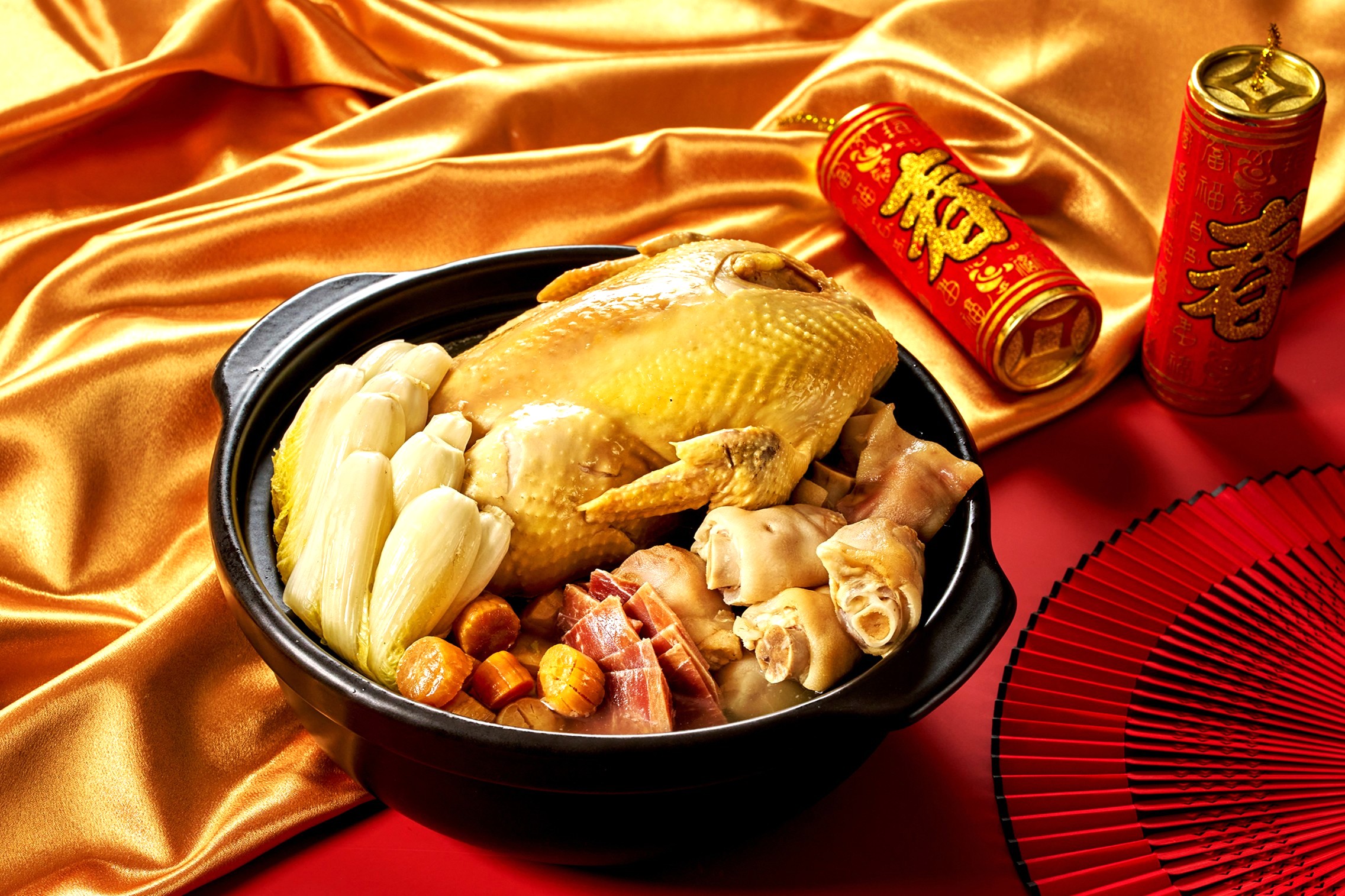 新春家宴不可或缺的雞、魚料理更是推薦焦點。「古早放山白切雞」嚴選優質放山雞並以粵式控火低溫慢煮,使肉質滑嫩多汁且保有清甜油香;象徵年年有餘的「椒鹽香蒜金鯧魚」則將金鯧炸至外酥內嫩,拌入香蒜與椒鹽激發鮮味,是老少咸宜的宴席經典。此外,亦包含「鮑魚海參豆腐煲」等單價 780 元起的粵式精粹,外帶回家即可享用,隨餐提供加熱小卡,讓料理小白也能參考教學輕鬆熱菜上桌。