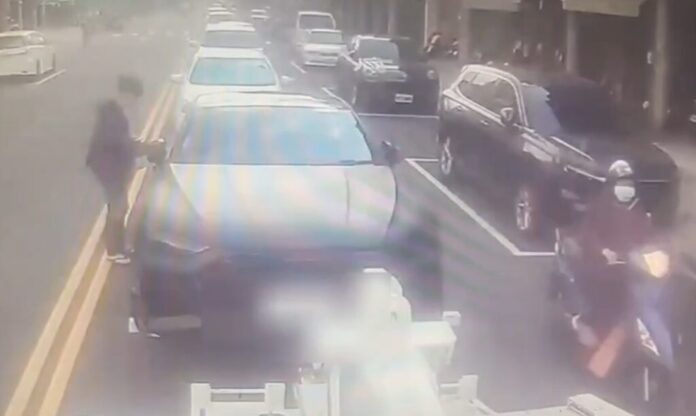 苗栗男子車輛違停被拖吊,竟一路跟著拖吊車趁停車時撕掉封條鑽入車內。翻攝畫面