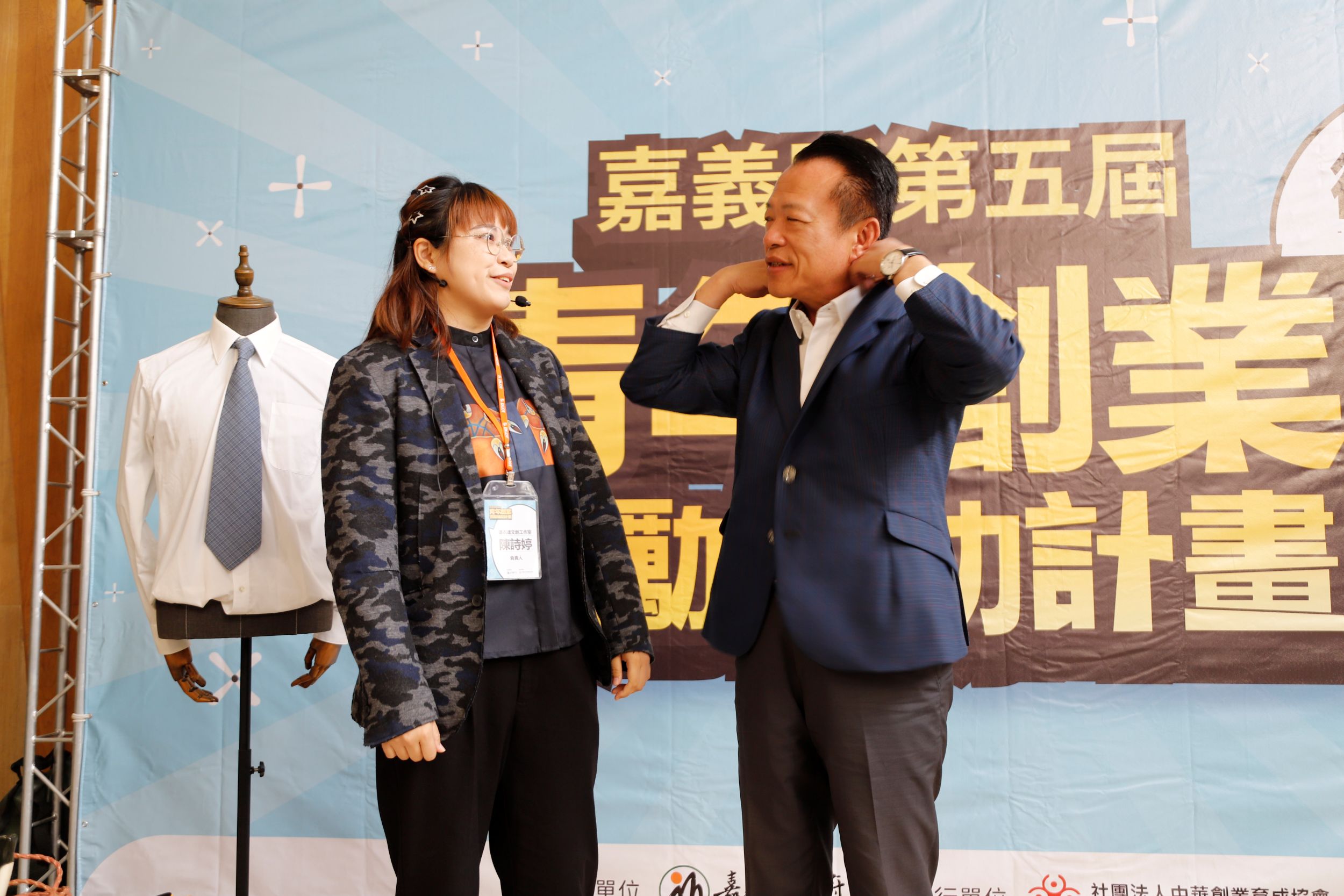▲曾獲青創補助的連衣連文創工作室陳詩婷,為翁章梁量身訂製手工西裝表達感謝。(圖/嘉義縣政府提供)