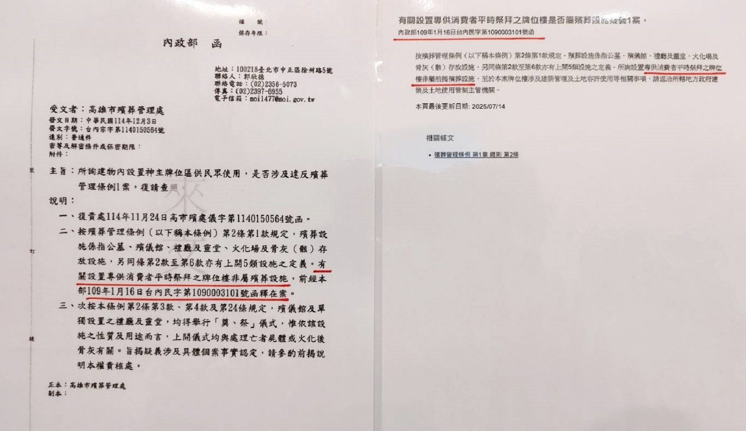 ▲針對外界曾質疑合法性的問題,吳友宏說明去年曾因神主牌位區遭誤認為殯葬設施而受罰,後經內政部函釋確認僅屬平時祭拜空間,原處分已撤銷。(圖/記者陳立驌攝)