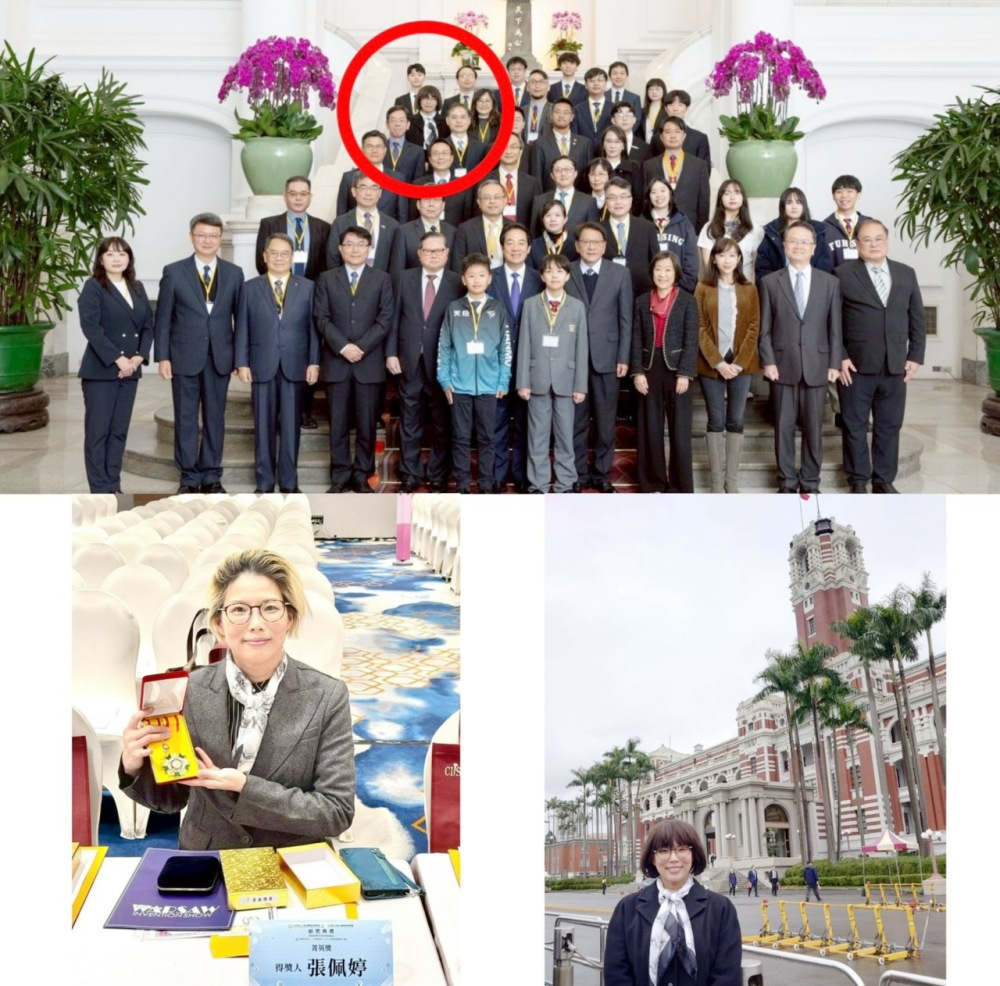 ▲宏國德霖科大張佩婷助理教授榮獲國際傑出發明家獎今日受總統表揚,上圖為得獎人大合照,左下圖為張佩婷得獎情形,右下圖為總統府前獨照。(圖/業者提供)