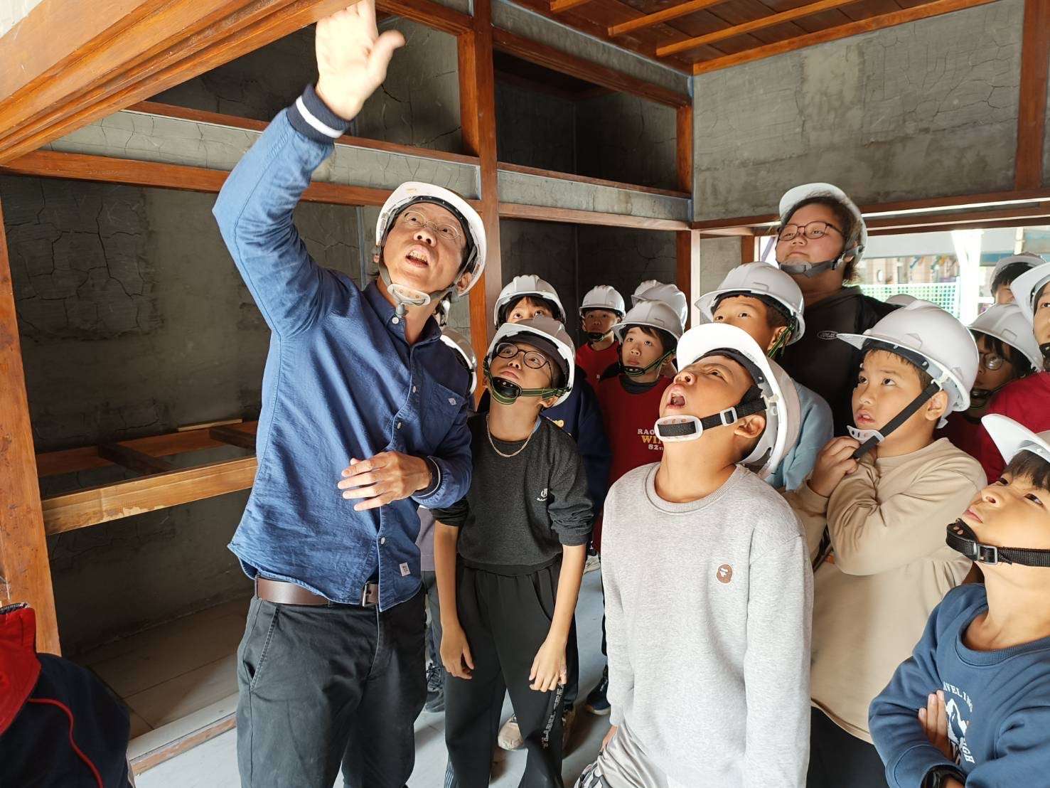▲縣府邀約莿桐鄉鄰近社區居民、饒平國小師生參與工地展,透過建築師導覽了解建築形式與之前生活型態。(圖/雲林縣政府提供)