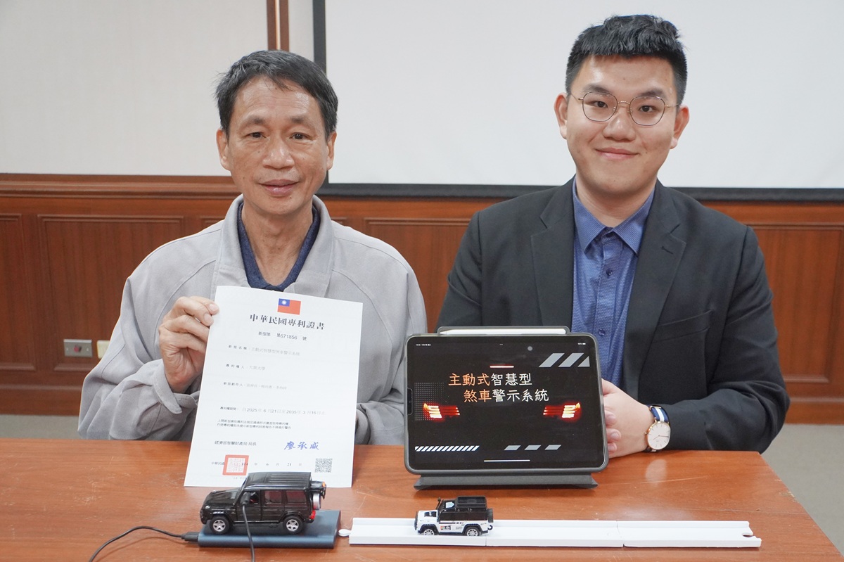 從自身開車經驗與社會新聞觀察到煞車警示可改良,大葉大學機械與自動化工程學系獲專利!張舜長教授指導大四學生楊尚憲、研究生李侑錞,結合即時感測與智慧判斷技術,提升追撞預警能力,開發「主動式智慧型煞車警示系統」,取得新型專利。