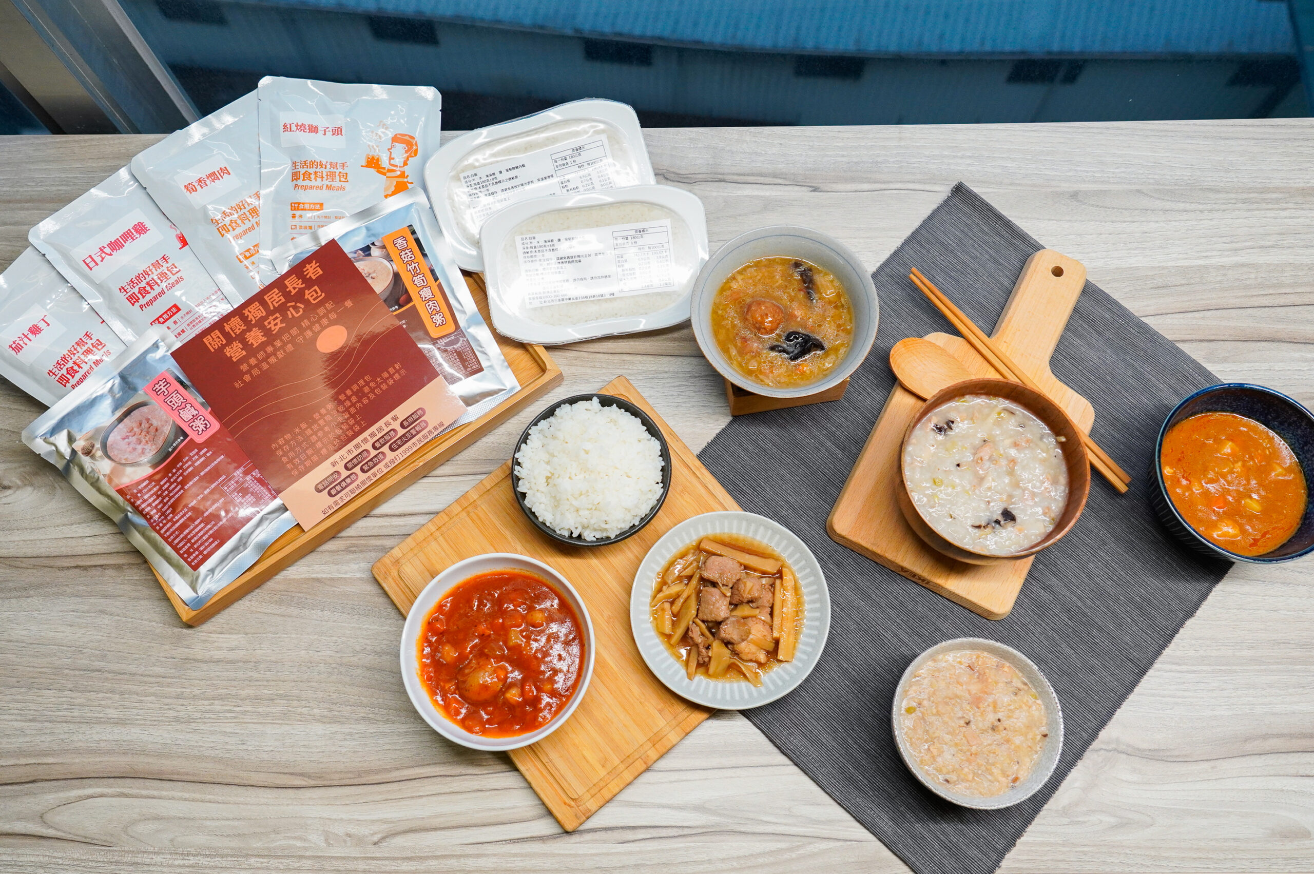 ▲「關懷獨居長者營養安心包」內含筍香燜肉、日式咖哩雞、紅燒獅子頭、茄汁雞丁四款美味調理包及芋頭鹹粥、香菇竹筍瘦肉粥和2盒白飯。(圖/新北市社會局 提供)