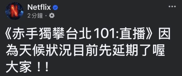 【賴傳媒、記者爆料網 王俊勝/台北報導】Netflix原訂今(24)日上午9點全球直播極限節目《赤手獨攀台北101:直播》,美國攀岩傳奇艾力克斯.霍諾德原本要徒手挑戰台北101外牆,結果因為天候不穩,Netflix稍早在台灣官方臉書宣布,直播活動先「確定延期」,讓大批守在螢幕前的觀眾直呼可惜。