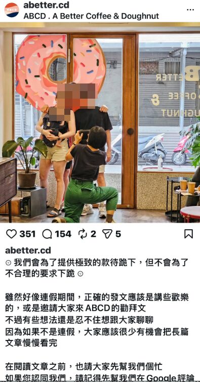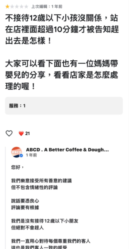 有網友在Threas發文指出,帶著6歲小孩來買甜甜圈。我們要外帶,小孩靜靜的跟在我旁邊,沒有影響到別人。店家:「我們沒有招待12歲以下的小朋友」我:「我要外帶,點了就走了」店家:「我們就是沒有招待12歲以下的小朋友」我:「我只是要外帶,沒有要你們招待他,我點了就走了。我一個人帶他來,怎麼能讓他自己在外面等?」店家卻跳針:「我們就是沒有招待12歲以下的小朋友」執意要趕小孩出門。連點餐短短時間(沒有排隊)都不願意讓孩子踏進門。最後還問我:「我們就是不招待12歲以下的小孩,妳有什麼問題嗎?」我說:「我不會再來了」他說他們沒差。