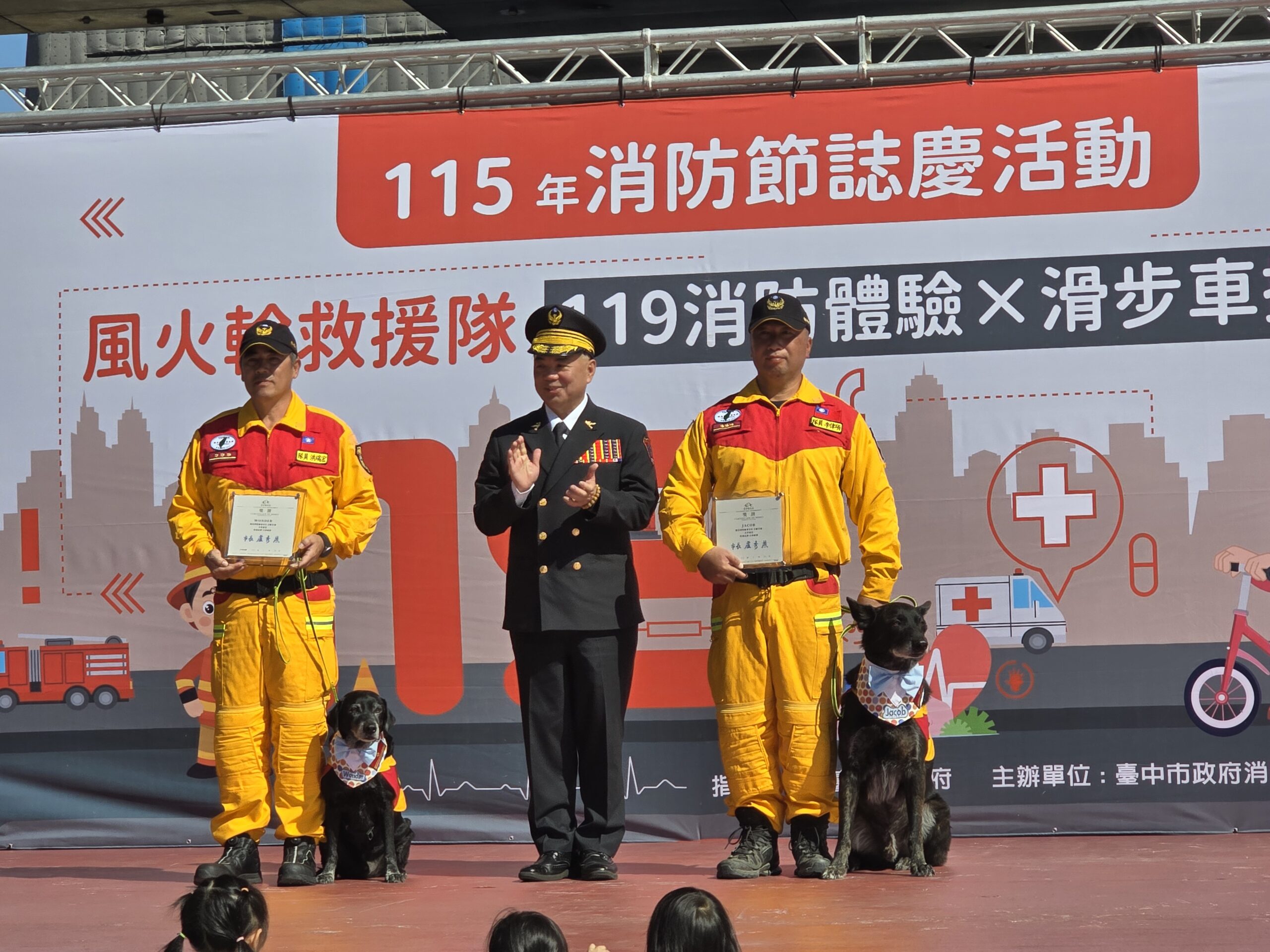 活動現場設有豐富多元的消防體驗與舞台節目,包括水滅火器射水體驗、消防衣著裝、VR防災體驗及搜救犬互動等闖關遊戲;舞台區則邀請東森幼幼台哥哥姊姊帶來活力帶動跳,並安排消防形象大使演出,搭配美食市集,現場氣氛熱鬧溫馨,適合全家大小一同參與。