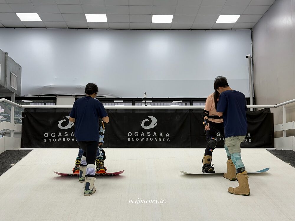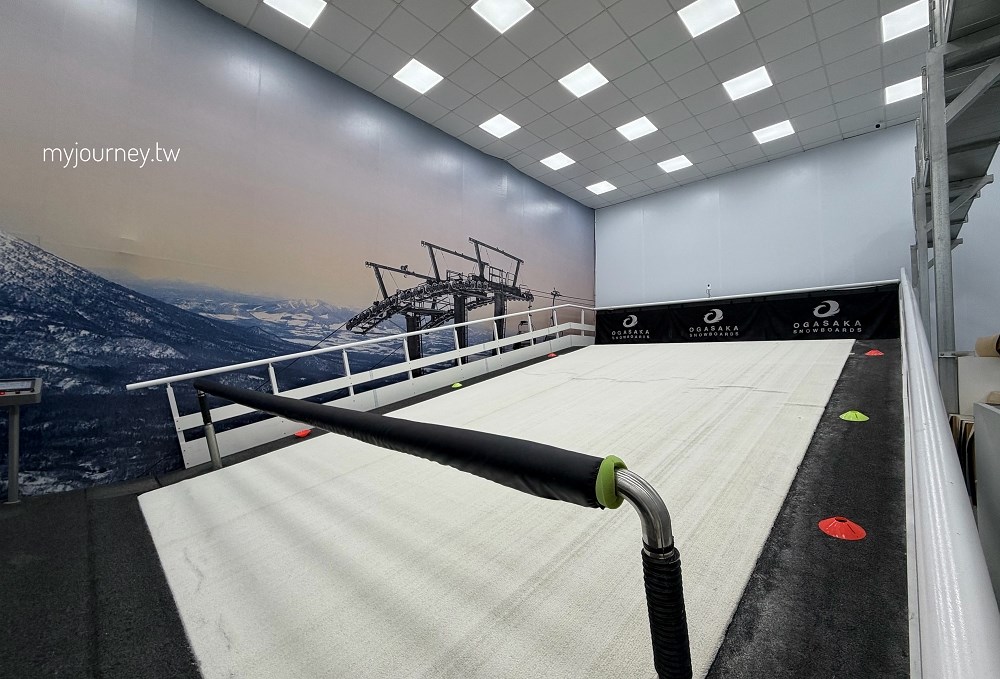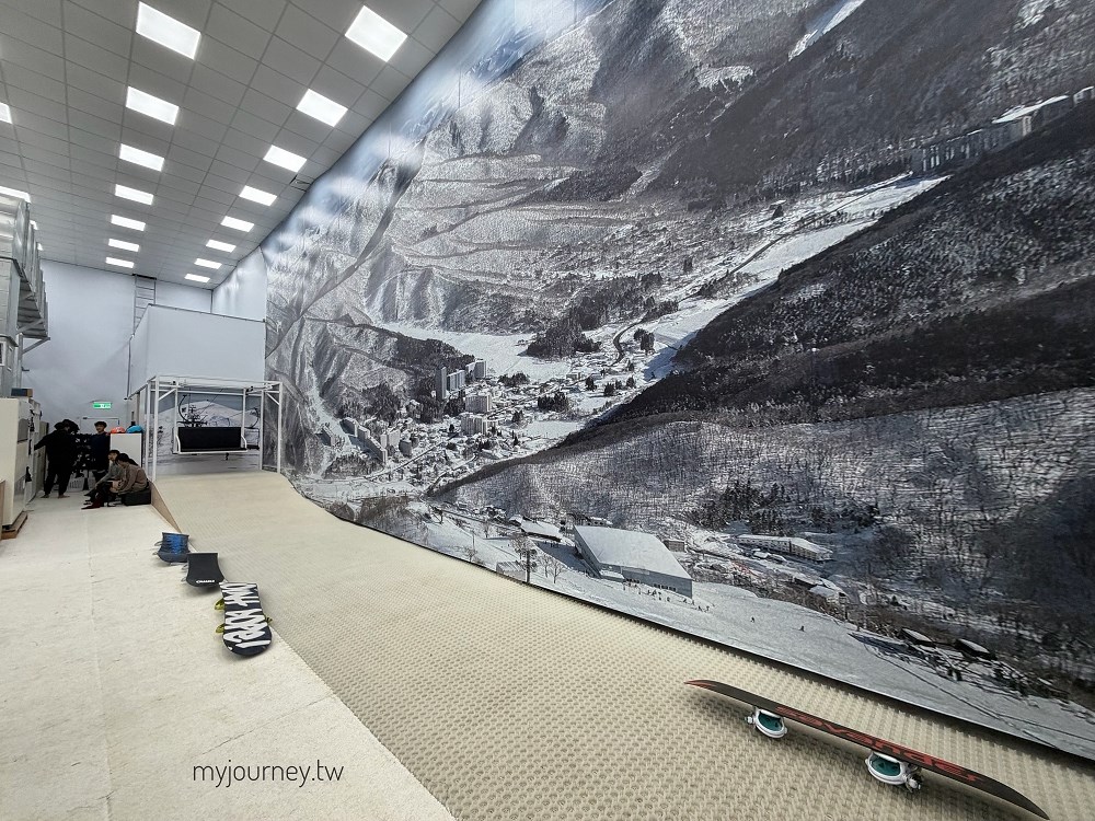 場內分為新手練習區與模擬滑行區,前者負責平衡感與纜車進出站訓練,後方的滑雪模擬機則像放大版跑步機,會依速度變化模擬雪地摩擦與轉彎慣性,看起來很帥,第一次站上去通常都很狼狽。