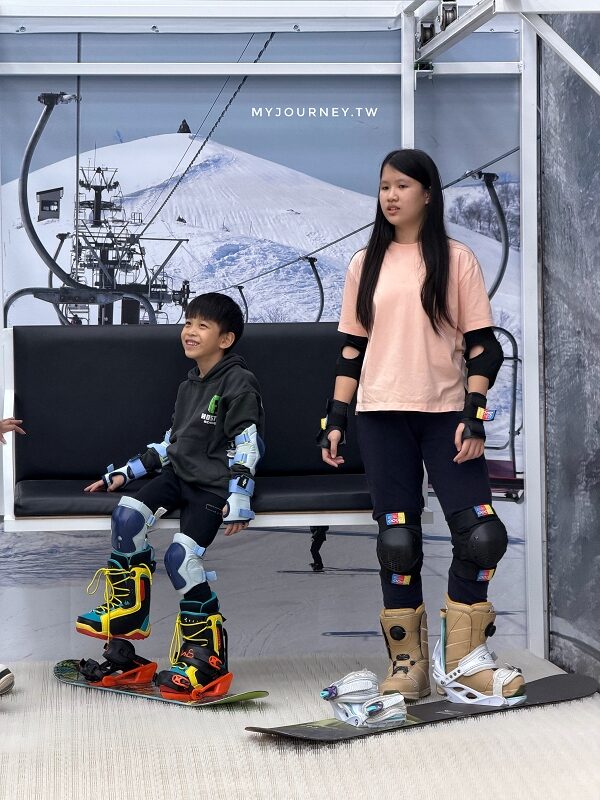 最實用的是纜車教學,上車要讓雪板與座椅平行、順勢坐下,下車時板子朝前、身體微傾滑離出口,這些若沒事先練過,到了真正雪場很容易手忙腳亂。至於單板課程,則從扶桿練平衡開始,反覆調整姿勢與核心出力,等抓到節奏放開雙手,那一刻真的有種「原來我也行」的小成就。