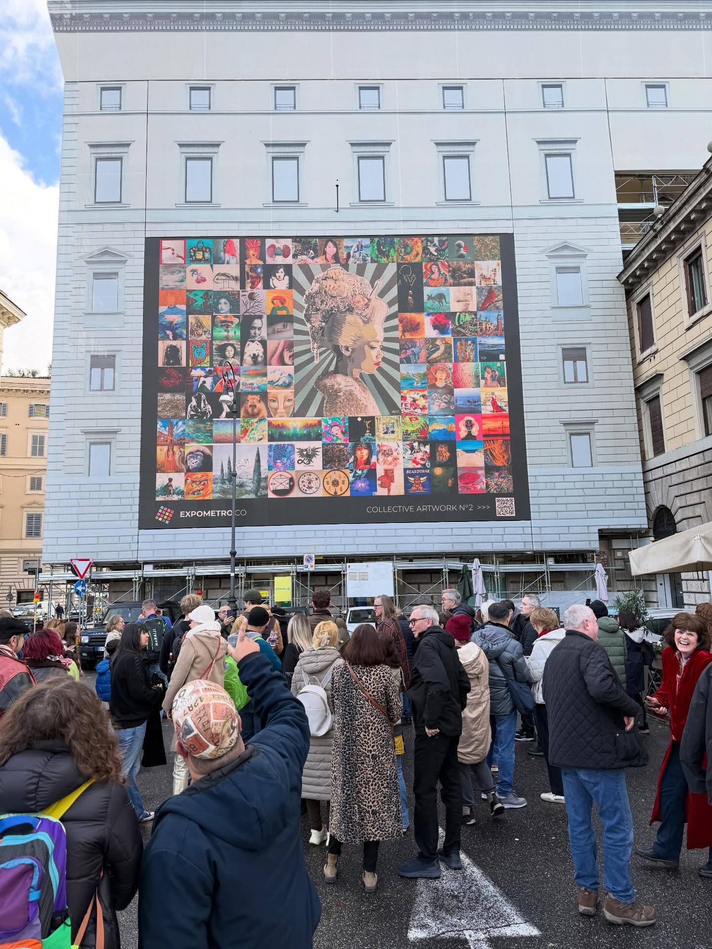 展覽選址於羅馬人流最密集的交通樞紐之一,兩座超大型 LED 螢幕分立於通往梵蒂岡的主要行人動線上。吳欐櫻、林仙悅、簡玄明、蔡玉雲、王大平、管仁娟、王敏如、王門傑、許燕黛、吳培基、許玉惠、李元芳、莊喜梅、林白雪、楊靜江、廖杏綺、周耀宗、周宸安等18位藝術家的作品,從每日清晨7點至深夜11點,進行長達 16 小時的連續滾動播出,全球559位藝術家的作品在高度曝光中與全球遊客對話。在為期兩天的展期中,台灣藝術家的作品被主辦單位選為主打焦點,置於正中間最顯眼處,在古典建築與摩登光影的交錯下,呈現跨越國界的視覺震撼。