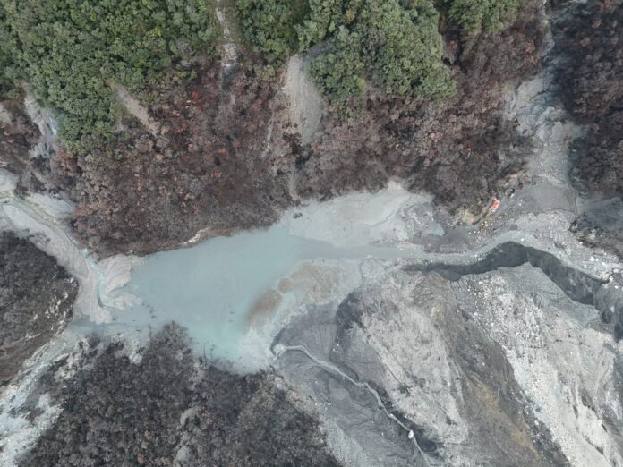 馬太鞍堰塞湖湖水幾已放乾,完成壩體降挖階段性任務。林保署花蓮分署提供