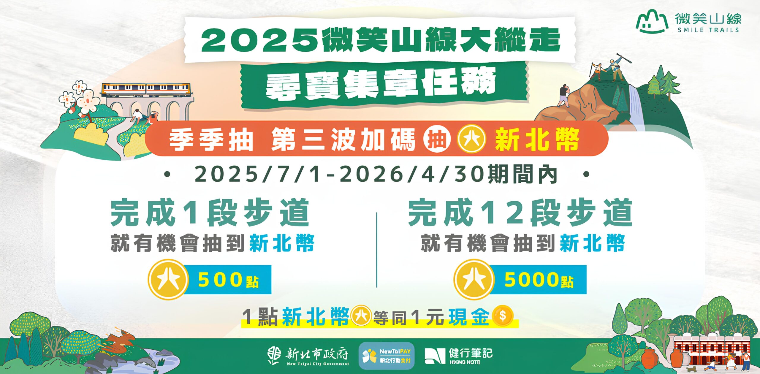 新北市政府觀光旅遊局長楊宗珉表示,新北市擁有豐富的登山步道與山林資源,為推動市民親近自然,並以「家山」為概念,串聯多條親民步道打造「微笑山線」,讓忙碌的現代人能輕鬆走進城市近郊山林。期望透過本次尋寶集章活動,讓民眾在健行運動之餘,也帶動沿線商圈與在地觀光發展,實踐「邊健行、邊健康、邊消費」的旅遊新模式。此次第三波季季抽再加碼新北幣點數,就是希望促進更多民眾認識並體驗新北五大山系,持續提升沿線觀光與步道休閒效益,讓大家在健行過程中完成成就、享受山林之美,並帶動市區與山區的旅遊互動。更多活動資訊及抽獎公告,請關注新北市觀光旅遊網、新北旅客臉書粉絲專頁、IG,以及「健行筆記」活動專區。