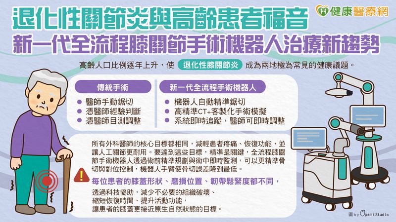 有鑑於傳統手術較難做到完全個人化的矯正,促使台韓兩地的骨科醫師積極導入科技輔助,透過新一代智能輔控全流程膝關節手術機器人,以臨床穩定性、操作便利性、與患者福祉為核心考量,為高齡患者提供更安全且更自然的治療選擇。