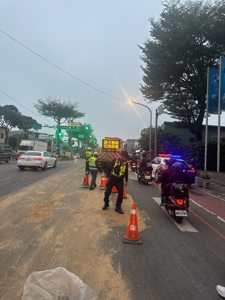 副所長王際華立刻帶著員警和交通中隊同仁封鎖部分路段進行交通疏導,經過仔細查看,發現大興西路往龍安街方向路旁有一大灘疑似油漬的液體,被經過的車輛輾壓後散佈到周邊道路,導致機車騎士一個接一個滑倒。警方馬上通報清潔隊和環保局到場鋪設木屑並清洗路面,同時循線找到肇事的蔡姓司機。