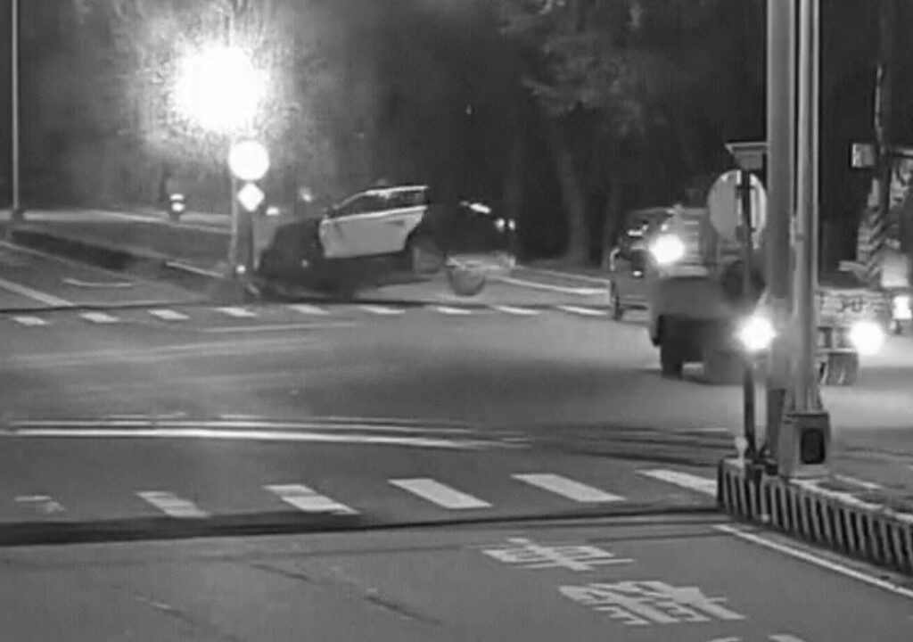 警車自撞分隔島再與1輛自小客車相撞。翻攝畫面