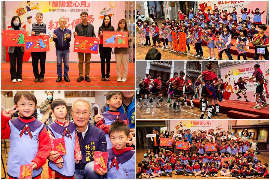 2026年「蘭陽愛心月」童心守護.紅包傳愛公益活動,27日上午在縣民大廳舉行。私立安康幼兒園的小朋友,以萬馬奔騰迎新春舞蹈精彩開場,美星文化隊帶來三首舞蹈曲目,透過童言童語、熱情可愛的歌舞為弱勢孩童加油打氣。