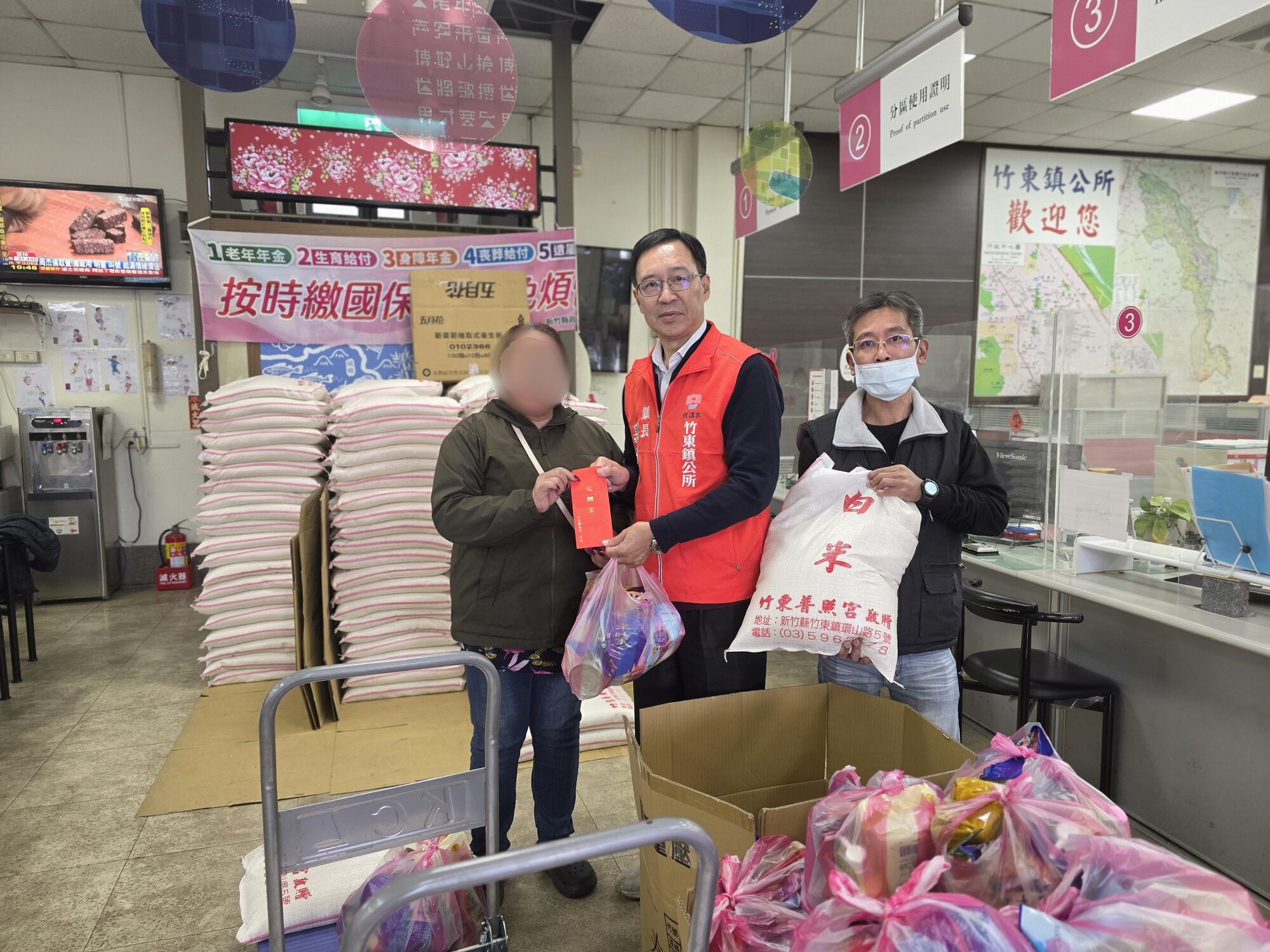 ▲新竹縣竹東鎮公所昨(27)日開始發放115年度低收入戶春節慰問金暨物資給低收入戶,鎮長郭遠彰(中)也在場協助發放。(圖/竹東鎮公所提供)