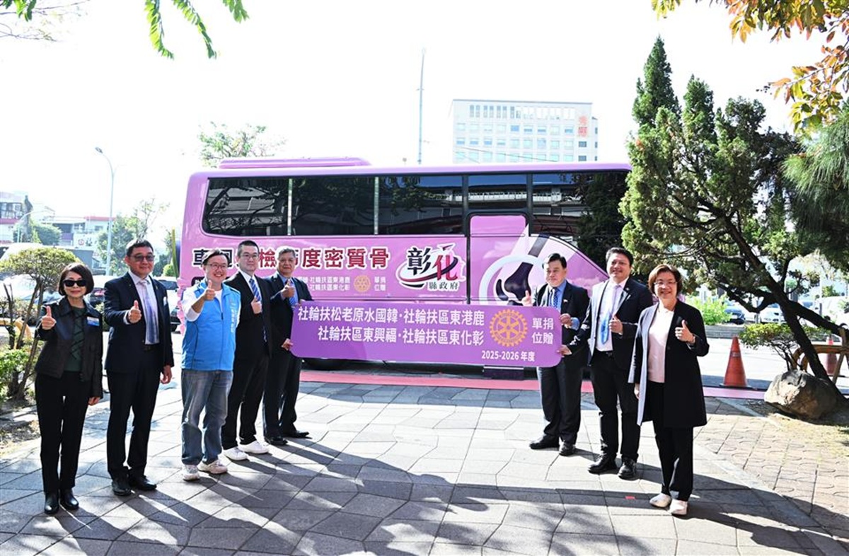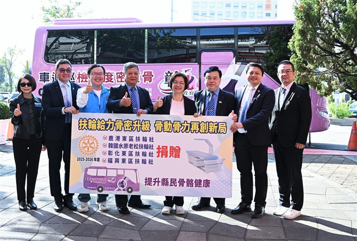 彰化縣政府於今日在衛生局舉辦「扶輪給力骨密升級,骨動骨力再創新局」扶輪社捐贈骨質密度檢測儀記者會,由縣長王惠美代表接受捐贈。此次活動展現本縣自108年推動骨質密度社區巡迴篩檢以來的豐碩成果,感謝國際扶輪社3462地區、鹿港東區扶輪社長謝一清、彰化東區扶輪社長劉燦霖、福興東區扶輪社長陳鼎中以及韓國水原老松扶輪社,與以上全體社員,共同捐贈全球獎助金7萬美元(超過新台幣210萬元),全力支持本縣推動骨質密度社區巡迴篩檢服務,攜手守護縣民骨骼健康。