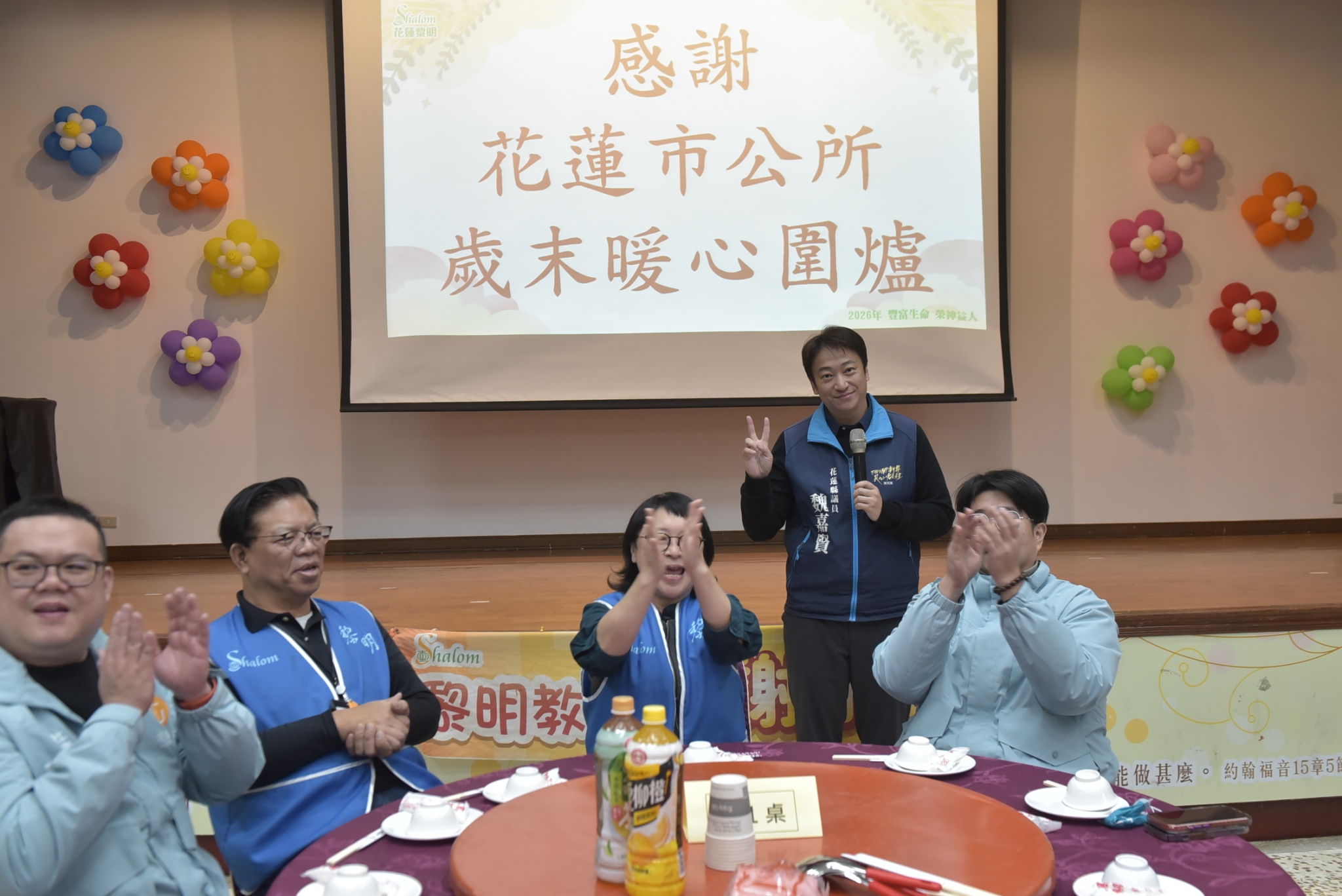 花蓮市公所愛心年菜列車今(28)日駛抵黎明教養院,市長魏嘉彥偕同縣議員魏嘉賢向黎明機構執行長梁桂花、教養院長邱淑義、院生及員工致意。強調市公所透過外燴方式提前讓院生們圍爐過年,表達表達滿心的關愛。