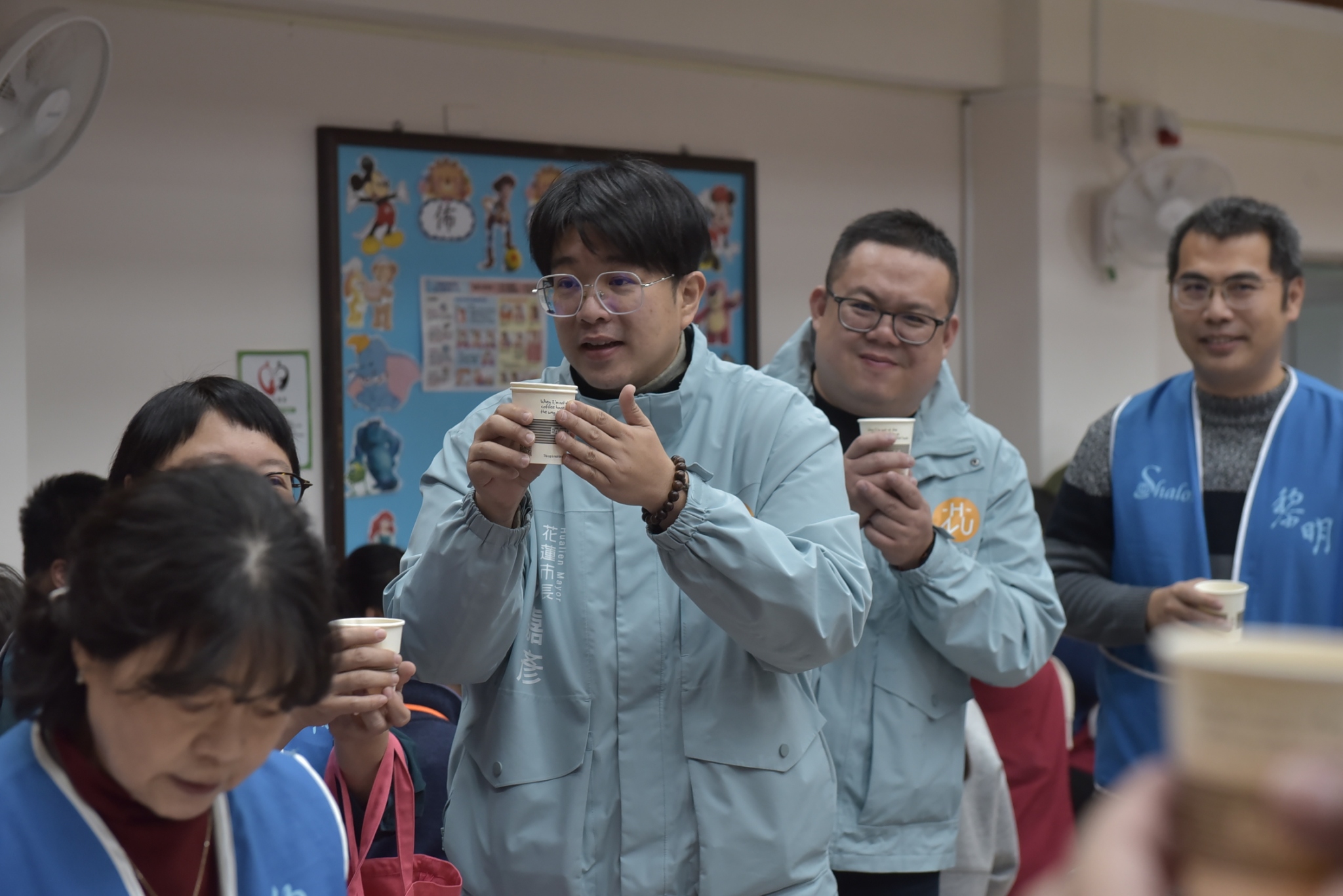 魏嘉彥由社勞課長蕭子蔚等人陪同前往黎明教養院,受到身心障礙院生們熱情歡迎,中午一道道年菜端上桌,院生們禱告感謝上帝的恩典後,開心大快朵頤,現場並有社工及老師協助行動不便的被照顧服務者用餐。