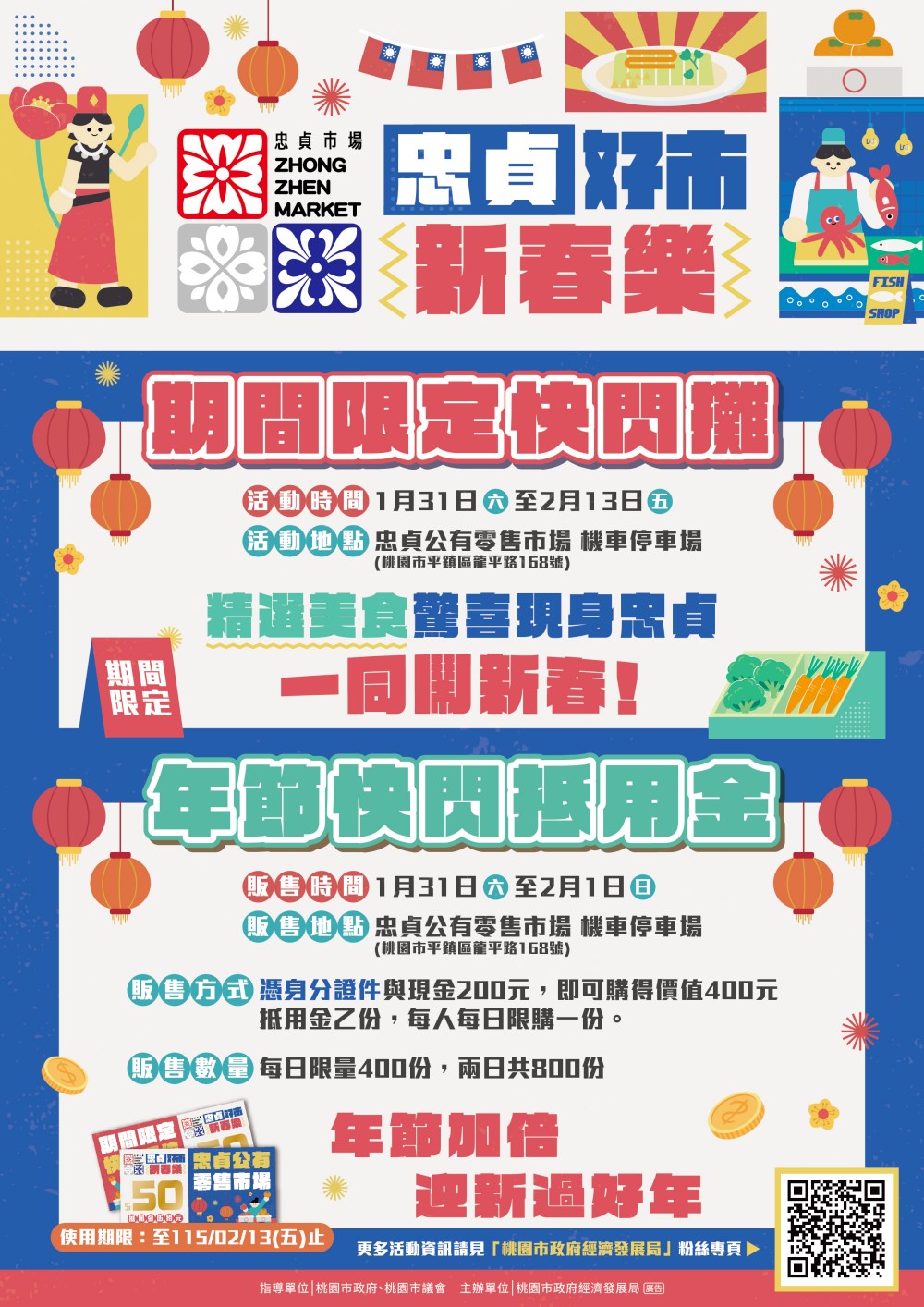 桃園市政府 1月31日(六)正式啟動「忠貞好市新春樂」活動,引進人氣排隊名攤快閃進駐,並推出「200元換400元」的超值優惠,邀請市民與遊客一同走進市場,感受最道地、最暖心的人情年味。