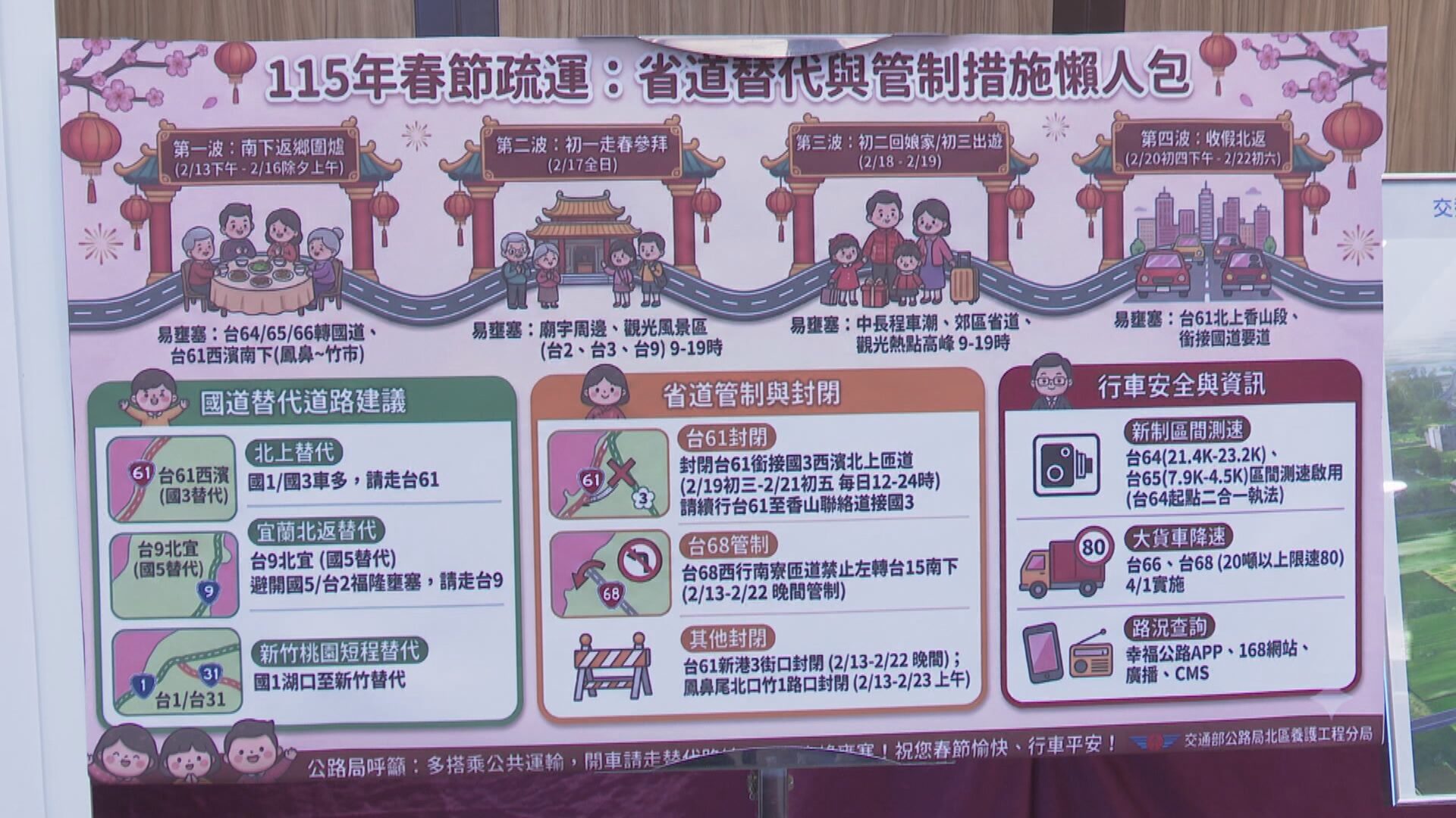 在新竹地區的容易雍塞的路段,公路局也規劃管制時段,尤其台61西濱公路轉國道三,以及台一線、台31線替代道路,呼籲用路人避開擁塞時段改走替代道路。