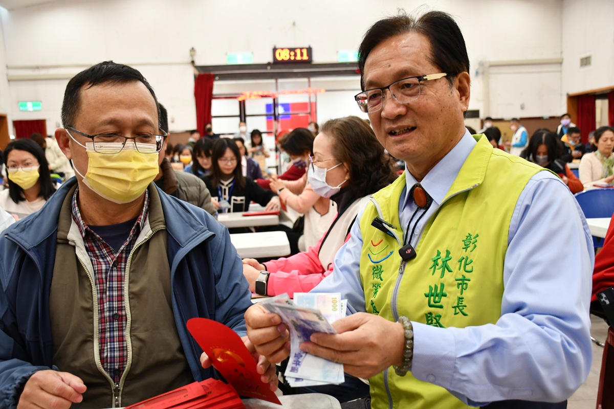 上午10點起,林世賢市長分別前往位於中山路一段189巷49號的南興里社區活動中心,以及位於中興路125號的光南里辦公處等地方,將禮金紅包親手交給長者們,並向長者們提早拜年,也祝福大家身體健康。