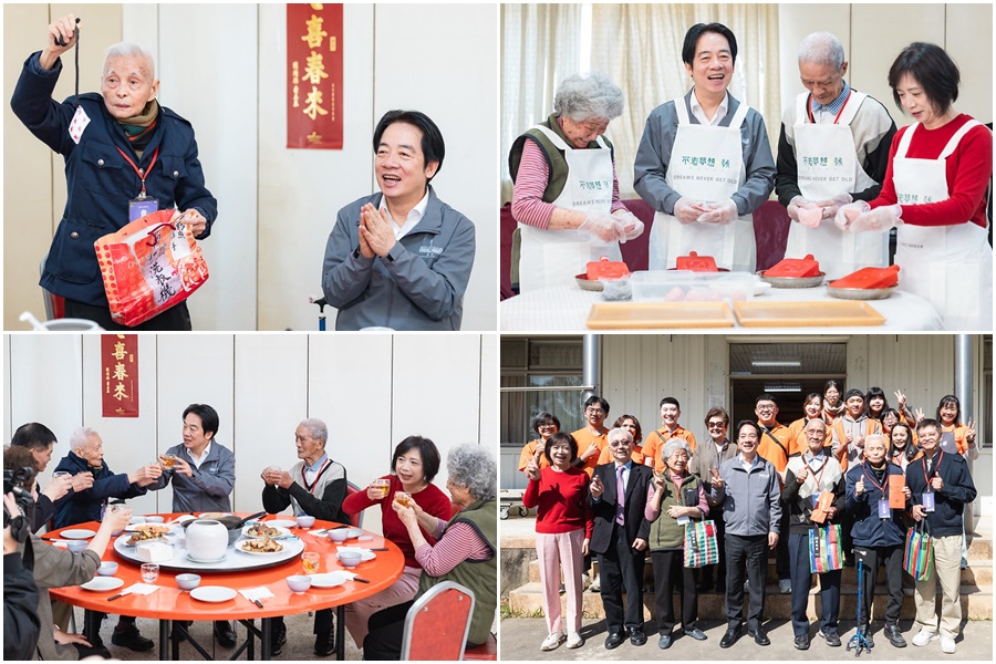 賴總統首先欣賞百歲爺爺的魔術表演,並與現場長輩一起貼春聯、製作紅龜粿及圍爐交流,氣氛熱絡溫馨。