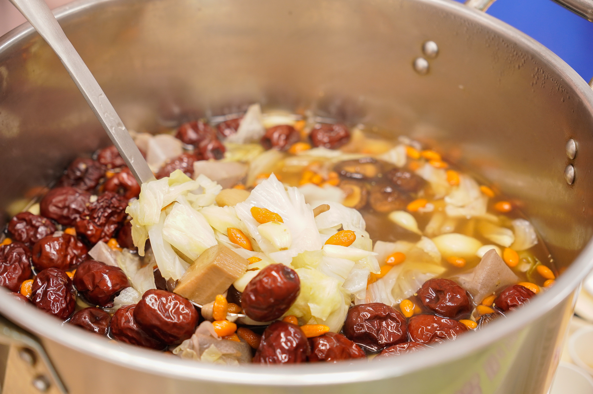 ▲捐贈會場用藥膳包加入紅棗、枸杞及高麗菜等燉煮 一時香味四溢。(圖/新北市社會局 提供)