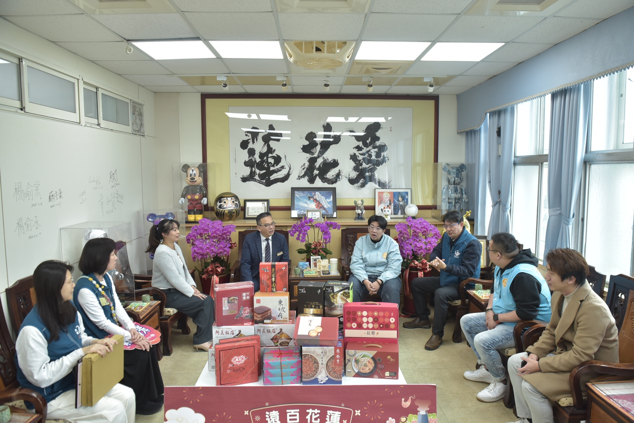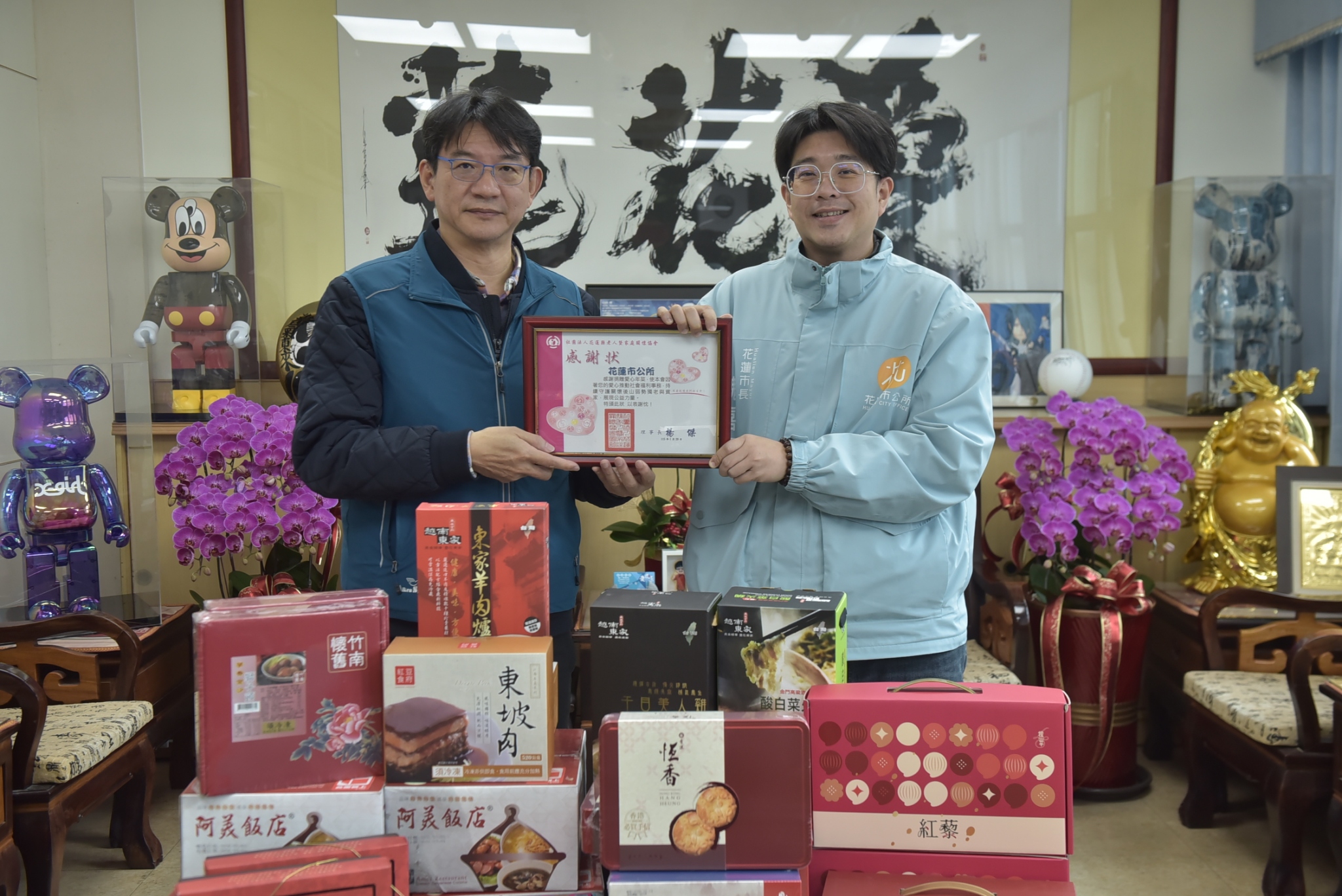 遠東百貨花蓮店精選知名品牌年菜及年貨禮盒共65份,昨天下午在花蓮市公所偕同市長魏嘉彥致贈花蓮縣老人暨家庭關懷協會,由執行長蔡智全代表受贈,期盼春節前夕能讓獨居長者感受過年歡喜氣氛。