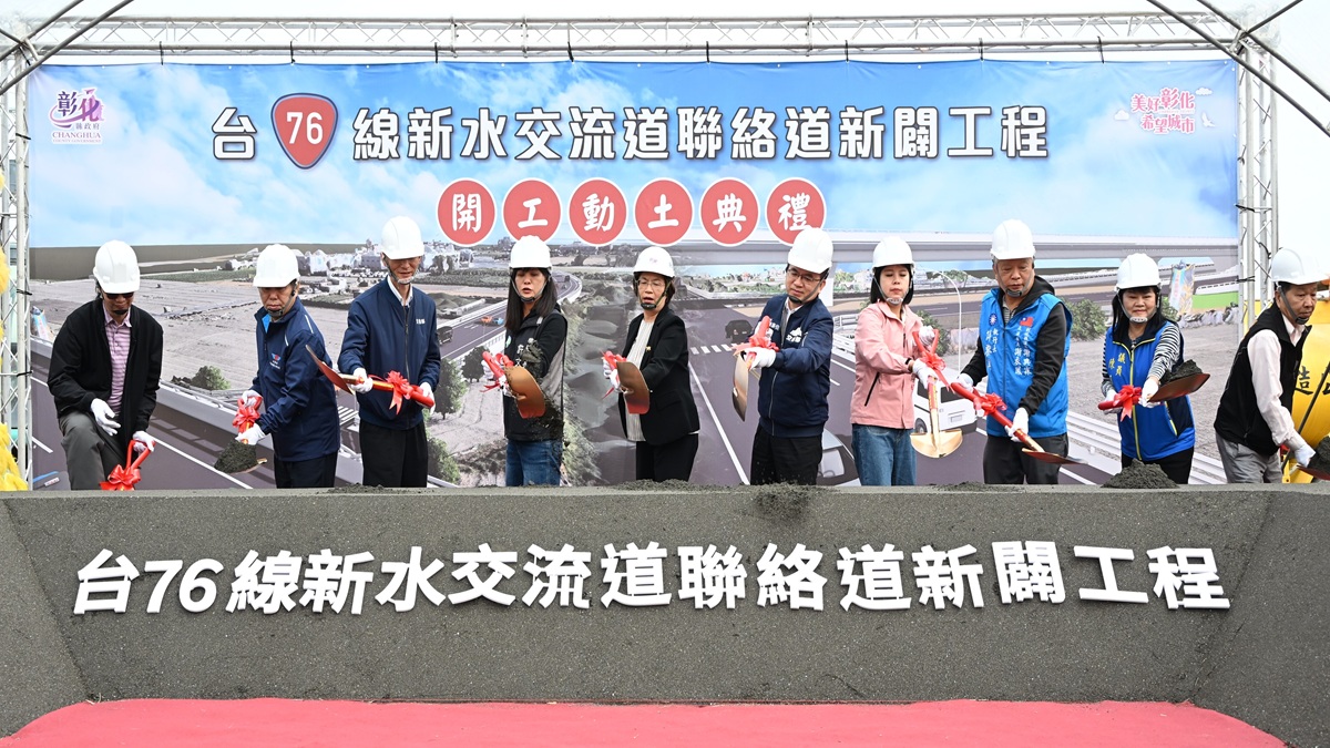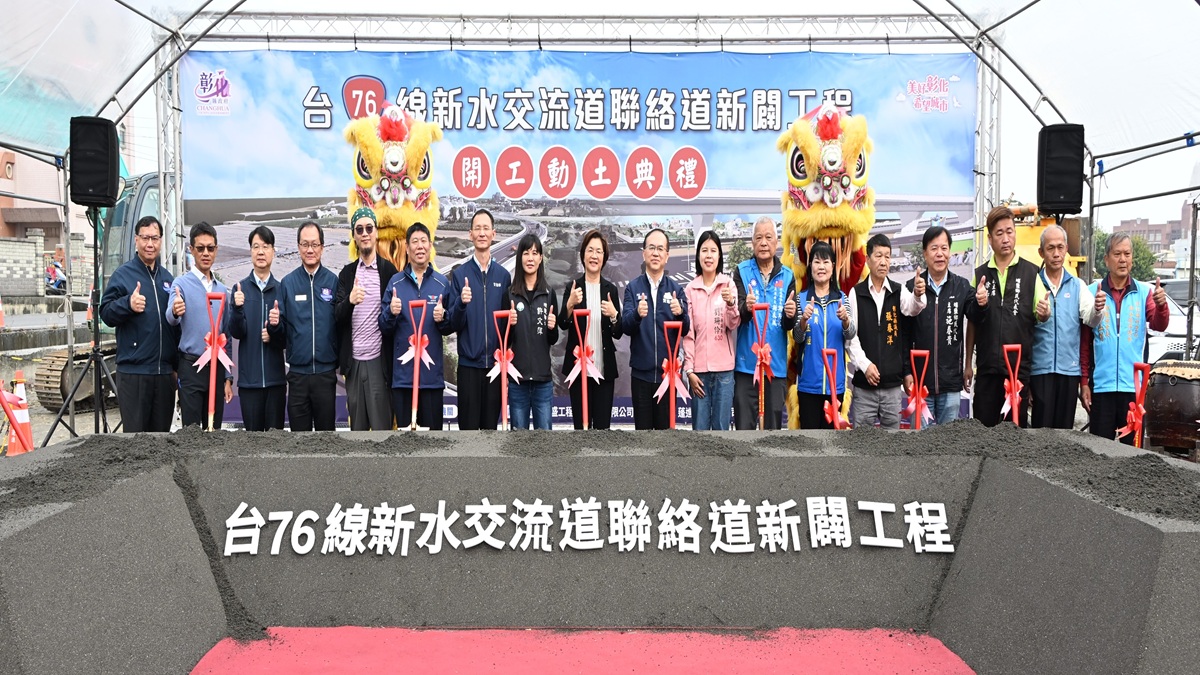 配合東西向快速公路台76線(原漢寶草屯線)台19線以西路段延伸工程計畫,並因應埔鹽鄉發展帶來的交通需求,彰化縣府積極向中央爭取經費,推動「台76線新水交流道聯絡道新闢工程」。今(30)日上午在台電埔鹽變電所前舉行開工動土典禮,縣長王惠美、交通部政務次長陳彥伯等貴賓與會。總工程經費5億7,145萬9,000元(中央補助4億6,288萬2,000元,縣府自籌1億857萬7,000元),工期720日曆天,預計於117年2月底前完工。另外為配合台76延伸工程今(115)年底通車期程,本工程新水交流道匝道至好金路路段預計於今年10月先行完工開放通行。