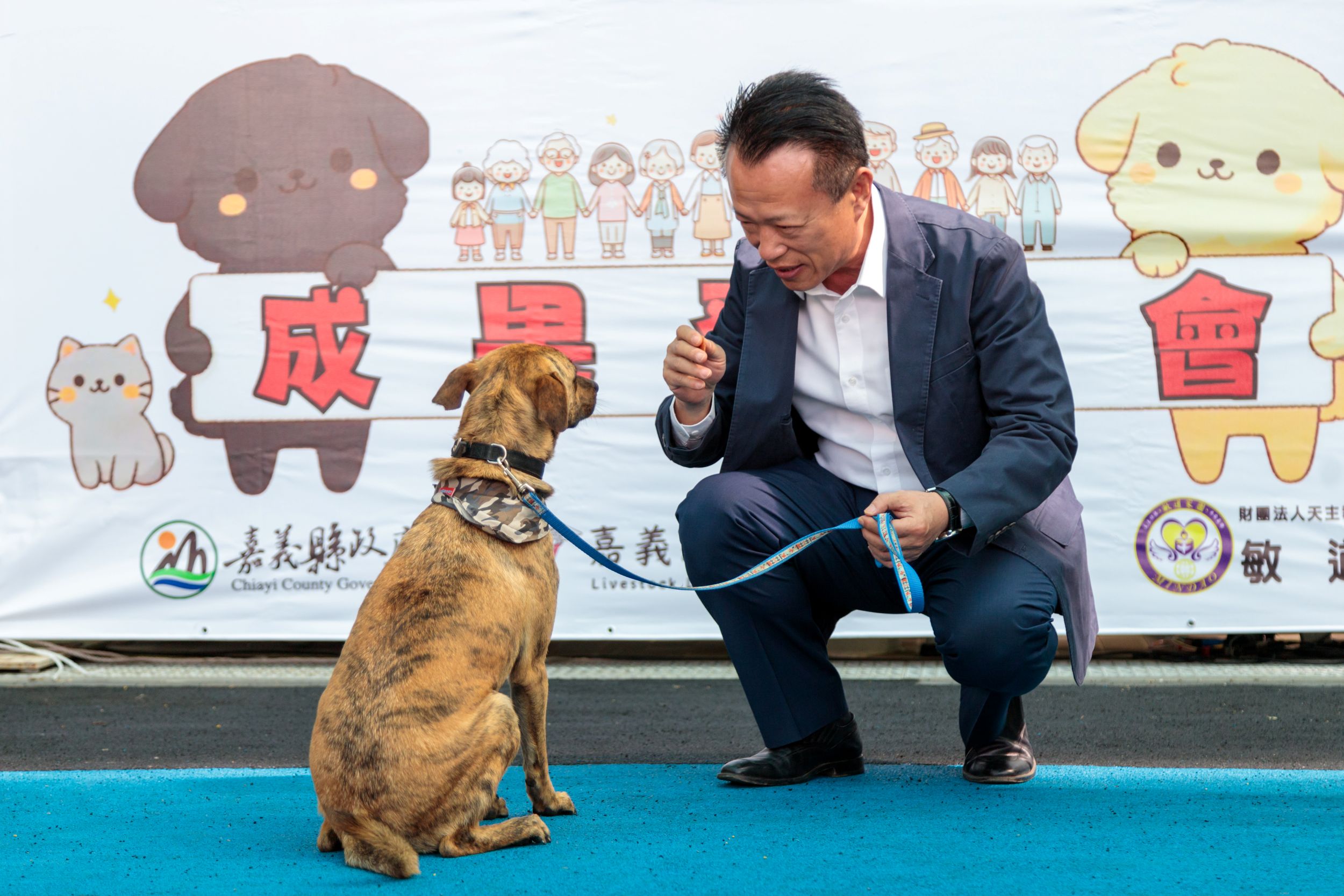 ▲縣長翁章梁示範流浪犬經過訓練後的溫馴成果。(圖/嘉義縣政府提供)