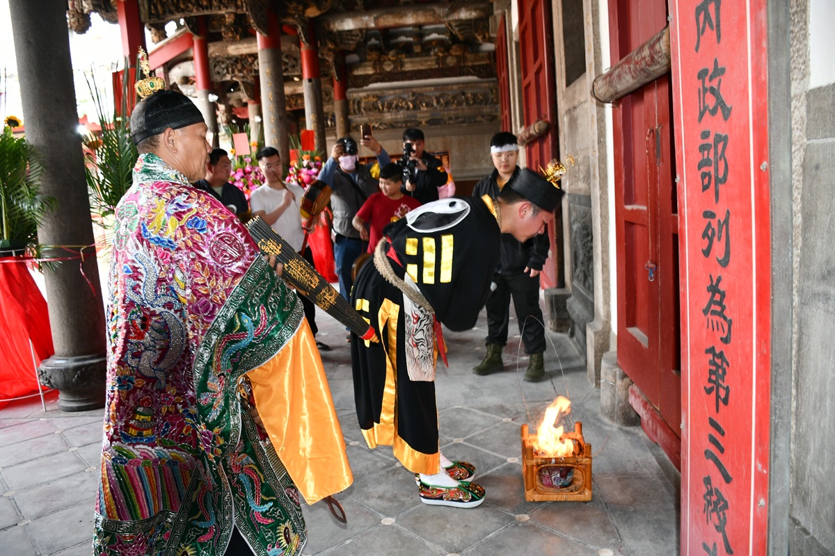 下午12點多完成遶境後,在扮成鍾馗的法師主持下正式打開整修已兩年多的南瑤宮廟門,開基三媽等神尊也終於南瑤宮管理人林世賢市長的恭迎之下「回家」,蔚為百年來的盛事!