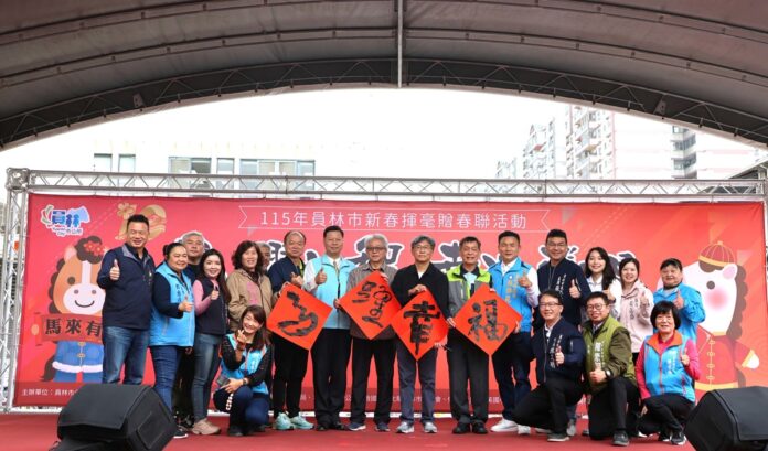 員林市公所今日在公所廣場前舉辦「馬耀新程・幸福飛揚」新春揮毫贈春聯活動,由員林市代理市長賴致富、立委謝衣鳳、縣政府秘書游筑凱、賴沛然,縣議員張錦昆、曹嘉豪,與員林市民代表會主席張國良暨各代表與里長,與員林市各國中、小校長與教師,以及救國團員林市團委會林文進會長等嘉賓,在歲末迎新的活動揭開序幕。