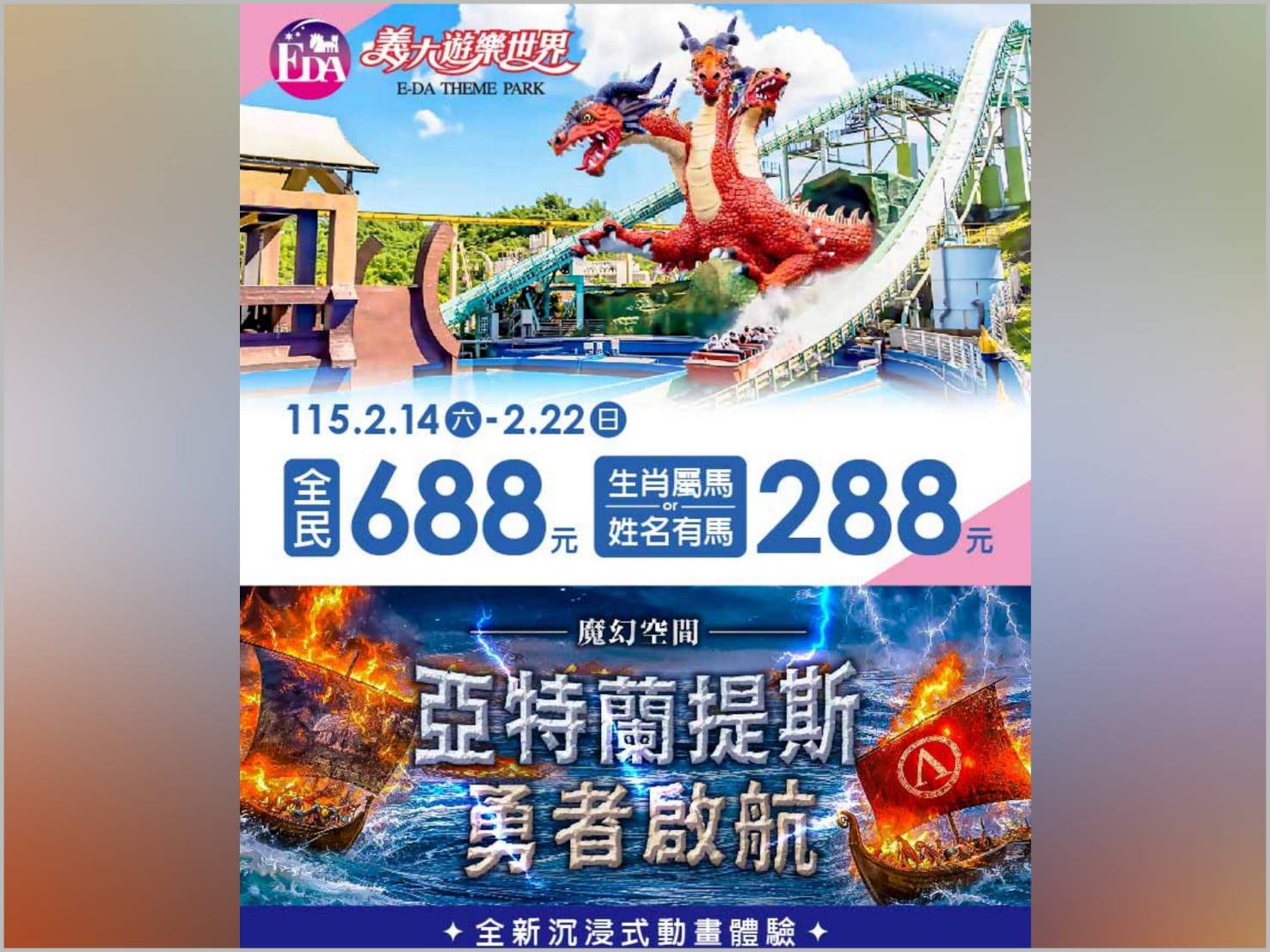 春節期間園區也同步推出話題優惠「義馬當先」,全民入園優惠價 688 元;另於 2 月 14 日至 2 月 22 日加碼推出生肖限定活動,凡生肖屬馬或姓名中含「馬」字的民眾,憑證件購票即可享 288 元專屬優惠,透過趣味話題設計,為春節出遊增添更多參與感與話題性。