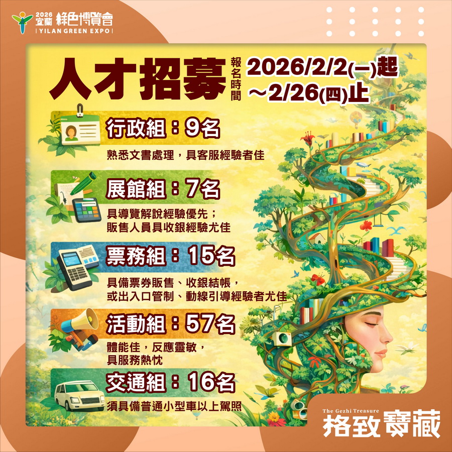2026宜蘭綠色博覽會將於3月28日至5月10日在武荖坑風景區盛大登場,工作團隊共有超過一百個職缺辦理徵才,即日起報名至2月26日止,歡迎對環境議題有熱情、希望參與大型活動實務的民眾踴躍報名應徵。