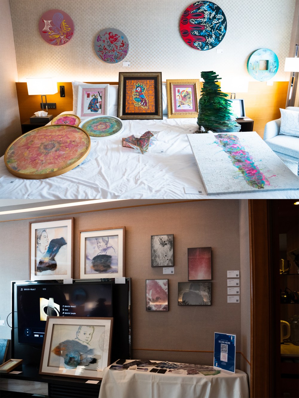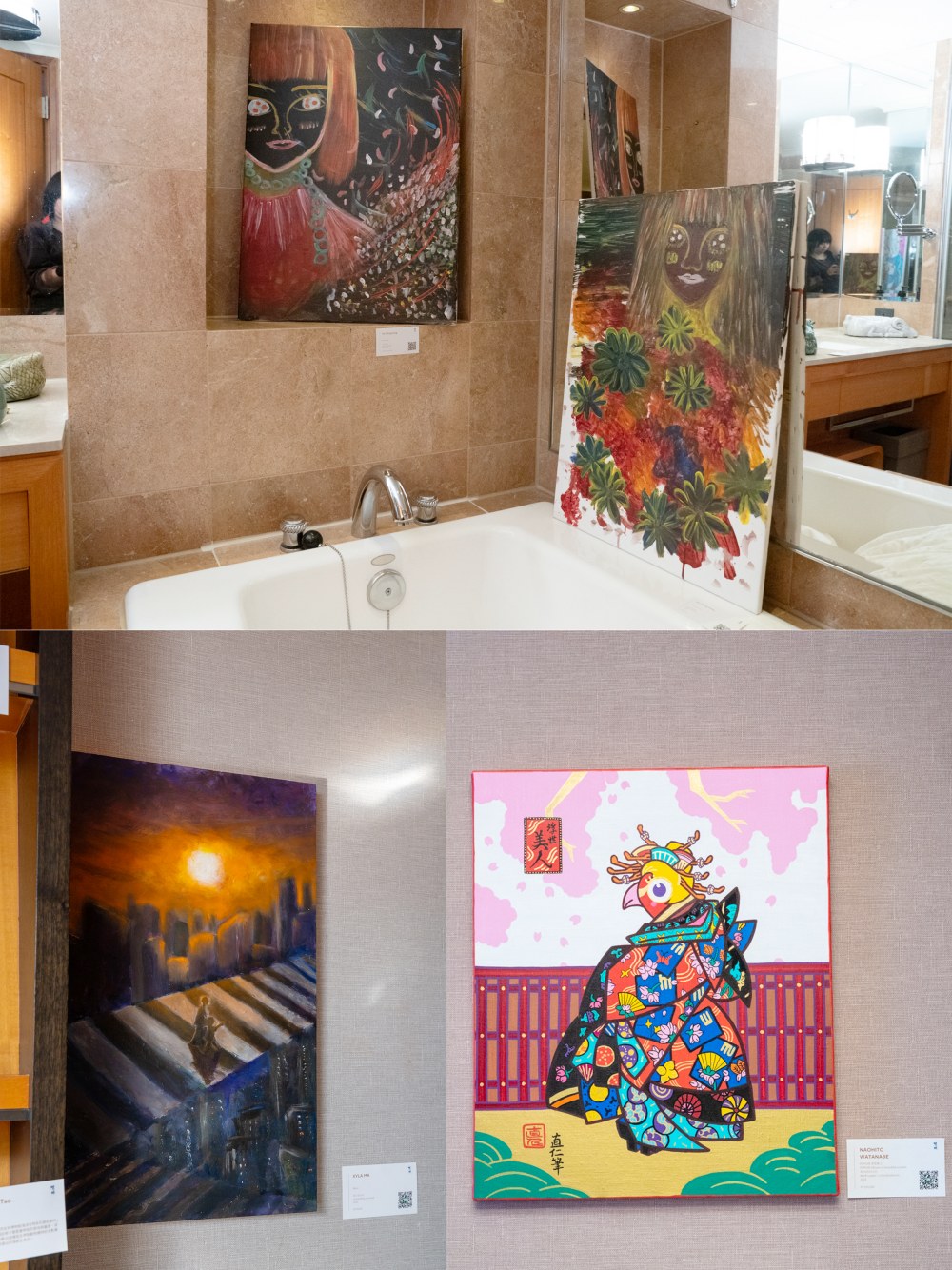在宏大的全球對話之外,台灣與旅外青年藝術家的微觀敘事同樣亮眼 :國家專利持有者 辜琪鈞 (ChiChun Ku): 曾與 Mercedes-Benz、Gucci 跨界合作的領軍人物。她以新型專利「膠彩架構複合材質」工藝,將傳統唐卡進化為具工業精準度的當代傑作 。知名美籍音樂人 Sam Lin(林仲軒) 在展期間對其作品流露極高讚賞,深受其融合傳統與現代的張力吸引。