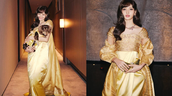 Lisa 活動紅毯上以一襲由法國百年時裝屋 BALMAIN 為她量身訂製的金色泰絲禮服登場,耀眼造型席捲社群,被網友封為「行走的泰國公主」。禮服的設計靈感來自 1960 年代 BALMAIN 創辦人 Pierre Balmain 為泰國詩麗吉王太后(Queen Sirikit)打造的春夏高級訂製服。當年王太后被譽為「亞洲最美王后」,她的造型也曾讓泰國文化在國際舞台大放異彩。此次 BALMAIN 重新詮釋王室經典,向歷史致敬,也為 Lisa 打造專屬於她的現代泰服版本。