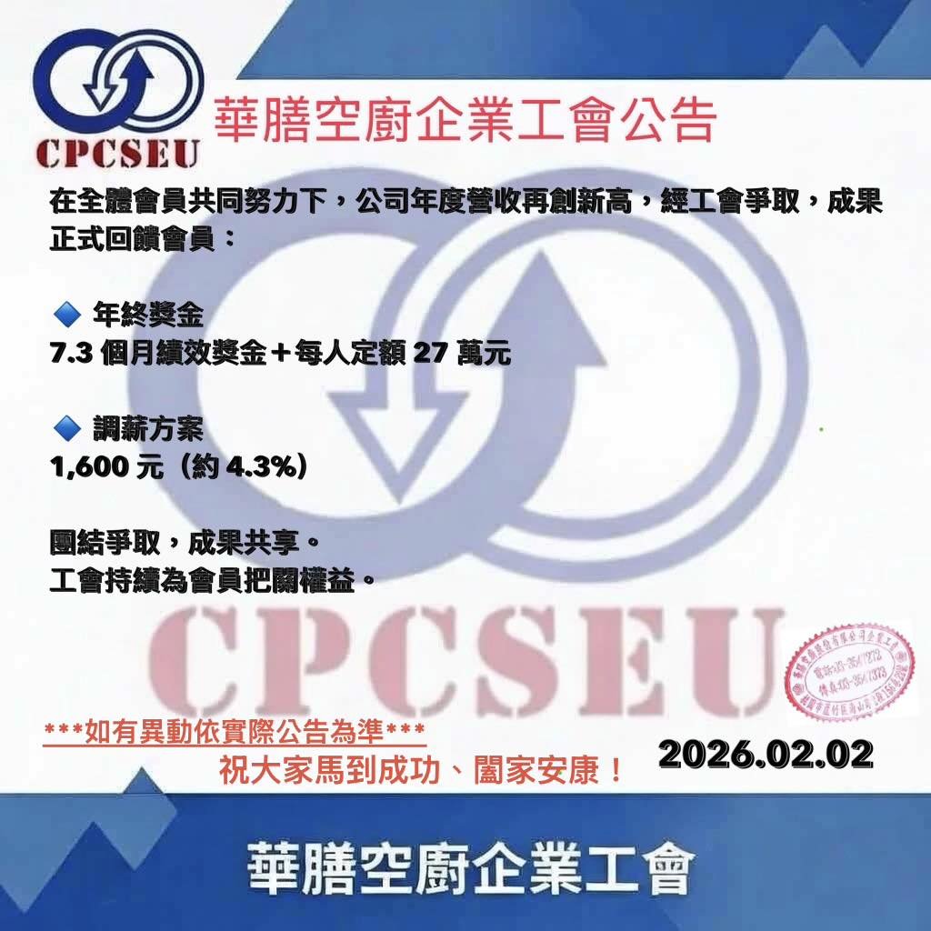 華膳空廚企業工會指出,在全體會員共同努力下,公司年度營收再創新高,經工會爭取,成果正式回饋會員。年終獎金7.3個月績效獎金(級距0.2)加上定額27萬;調薪方案1600元,(約4.3%)。