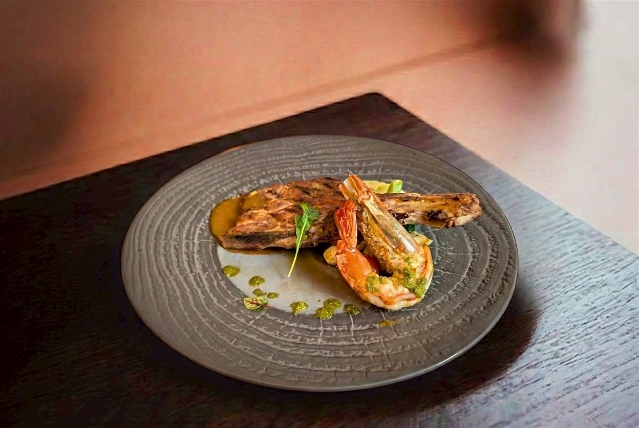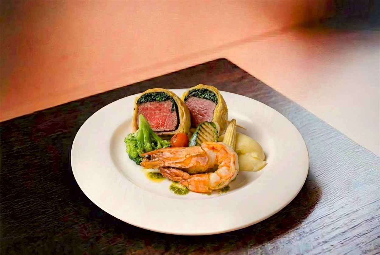 ▲「隱世情詩 極致海陸饗宴」的主菜之一的酥皮翼板牛佐青醬根島生態大蝦(圖/大地酒店提供)