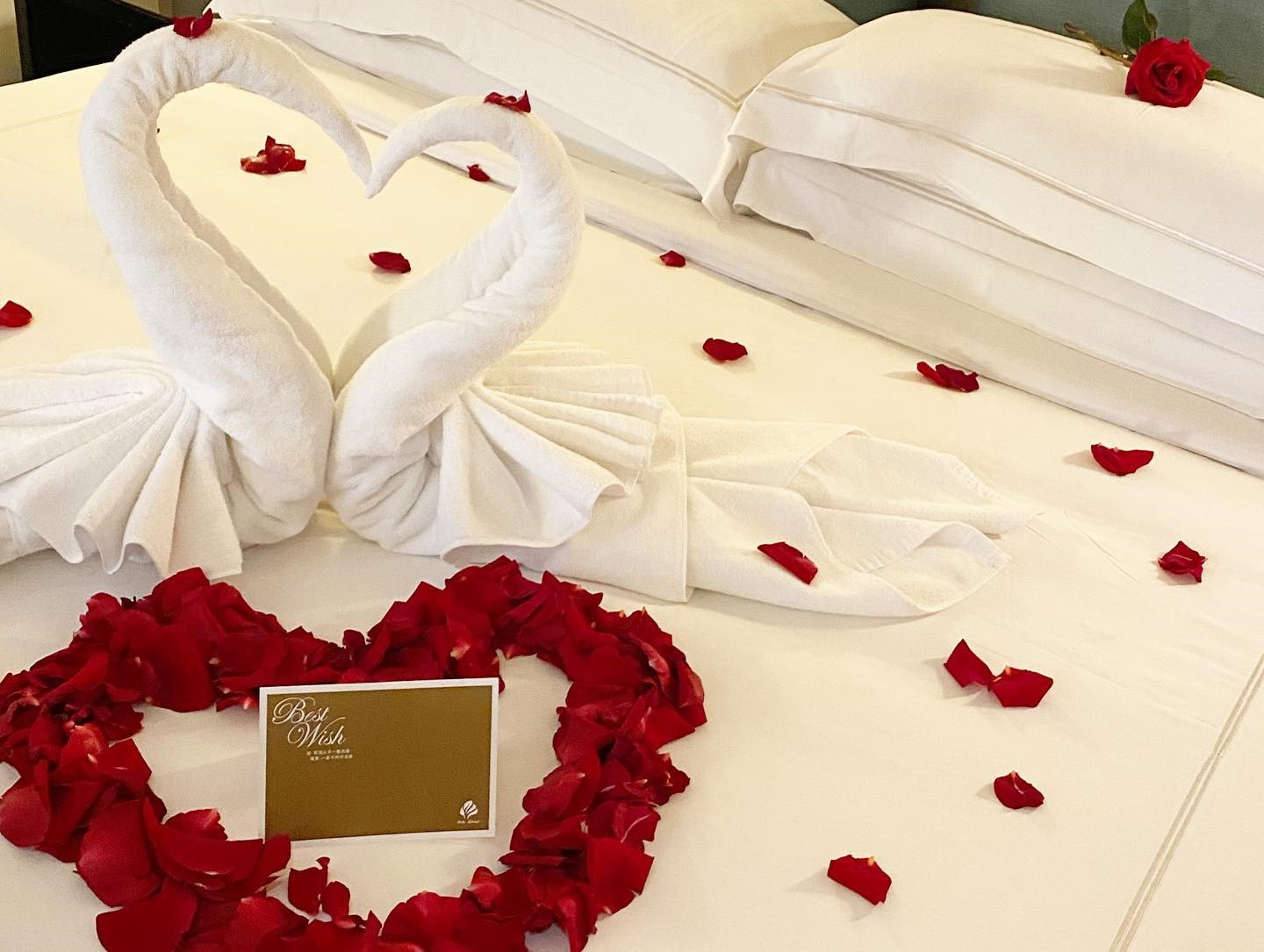 ▲房間中特別以玫瑰花瓣及天鵝造型毛巾妝點,營造私密溫馨的浪漫時光(圖/大地酒店提供)