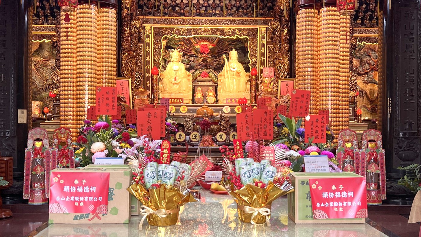 ▲全台土地公宮廟仙草蜜聚寶盆連線,泰山捐贈3888罐仙草產品祈願分享,拍攝地點為頭份福德祠。(圖/泰山企業提供)