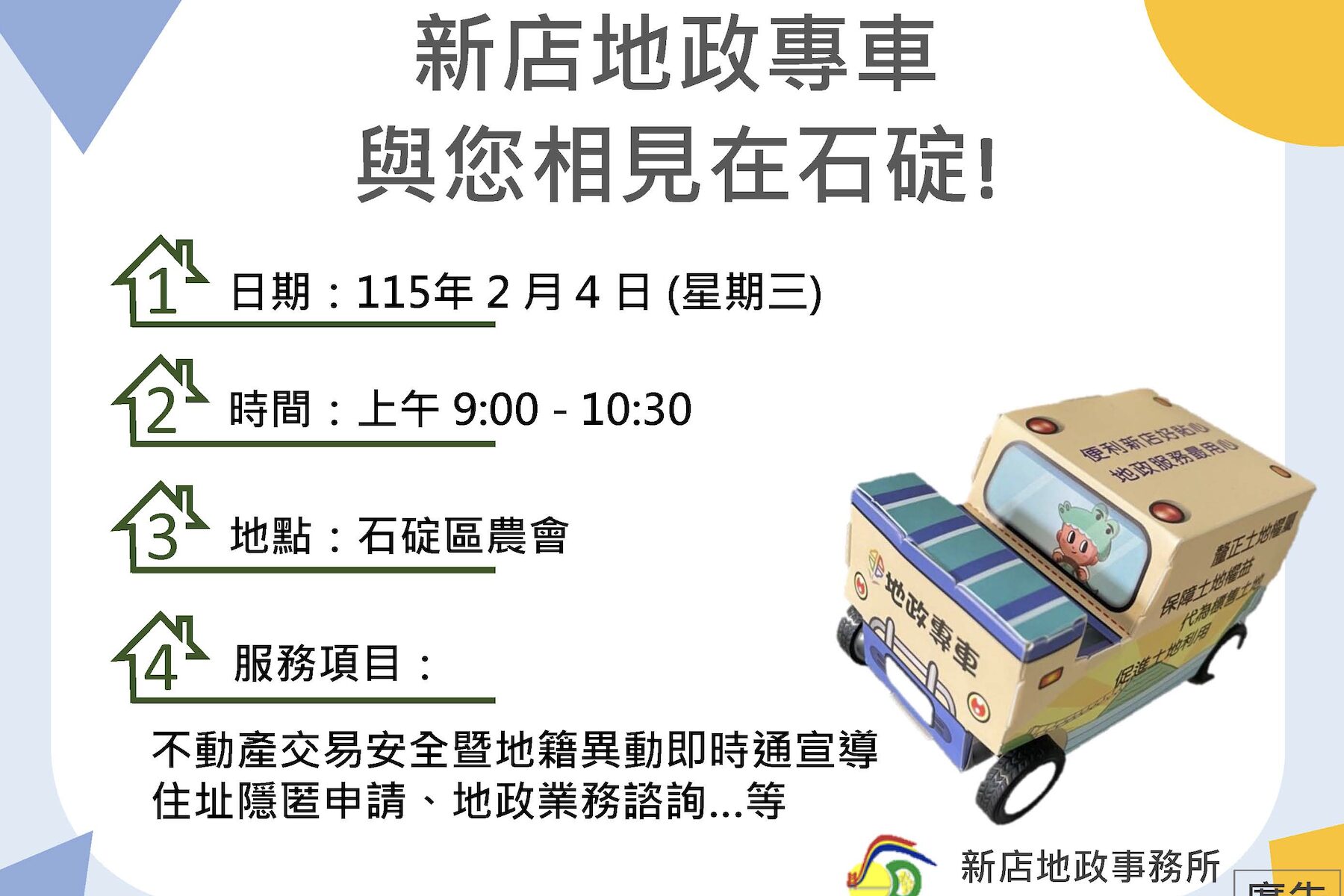 新北市新店地政事務所「地政專車」不動產交易安全暨地籍異動即時通宣導服務將於115年2月4日(星期三)上午9時至10時30分開至石碇區農會(石碇區碇坪路一段136號)囉,農會當日會舉辦農民節暨頒獎典禮,參加者當日只要來現場填答QRcode問卷,即可換取精美小禮物一份,歡迎各位鄉親一起來共襄盛舉!