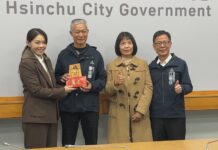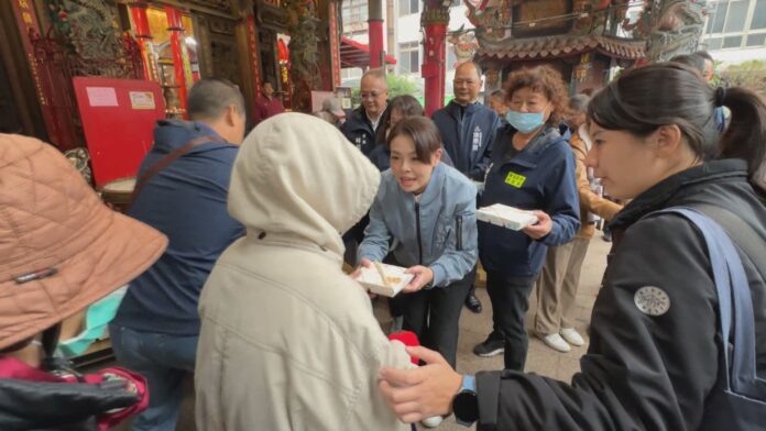 民眾依序排隊領取便當,由新竹市東區里長聯誼會攜手東寧宮,舉辦寒冬送暖・愛心便當發送活動,同時也邀請新竹市長高虹安到場發送,關懷弱勢朋友以及長輩。