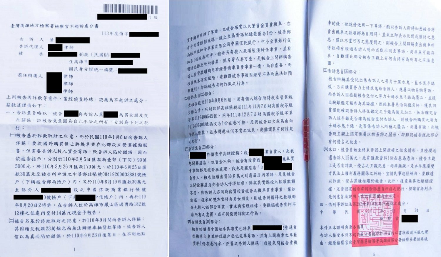 檢方彙整對話紀錄、匯款證明、借貸文件及公司登記資料後,原認定謝男利用感情關係使被害人陷於錯誤認知,交付財物,累計詐得金額高達435萬元,屬典型「愛情包裝投資型詐騙」。但案件在承辦檢察官更換後,卻出現不起訴處分,讓葉女難以接受。